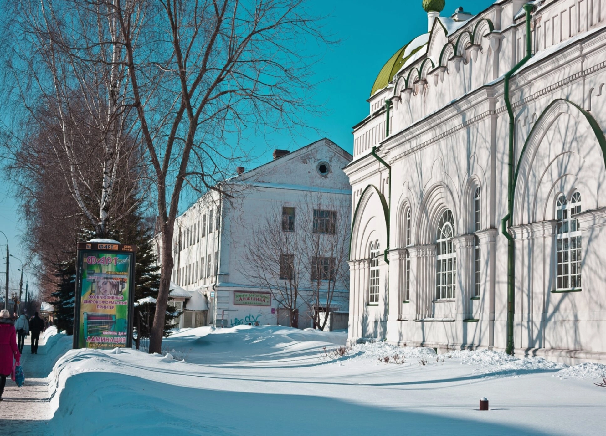На переднем плане видны прихожане, следующие по заснеженной тропе к святым вратам, что добавляет снимку живости и человеческого тепла. Оголённые ветви деревьев склоняются под тяжестью снега, напоминая о смирении и покорности перед Божьим промыслом. На заднем плане просматриваются городские строения, включая здание с вывесками, что подчёркивает гармоничное соседство духовного и мирского начал в жизни русского человека.