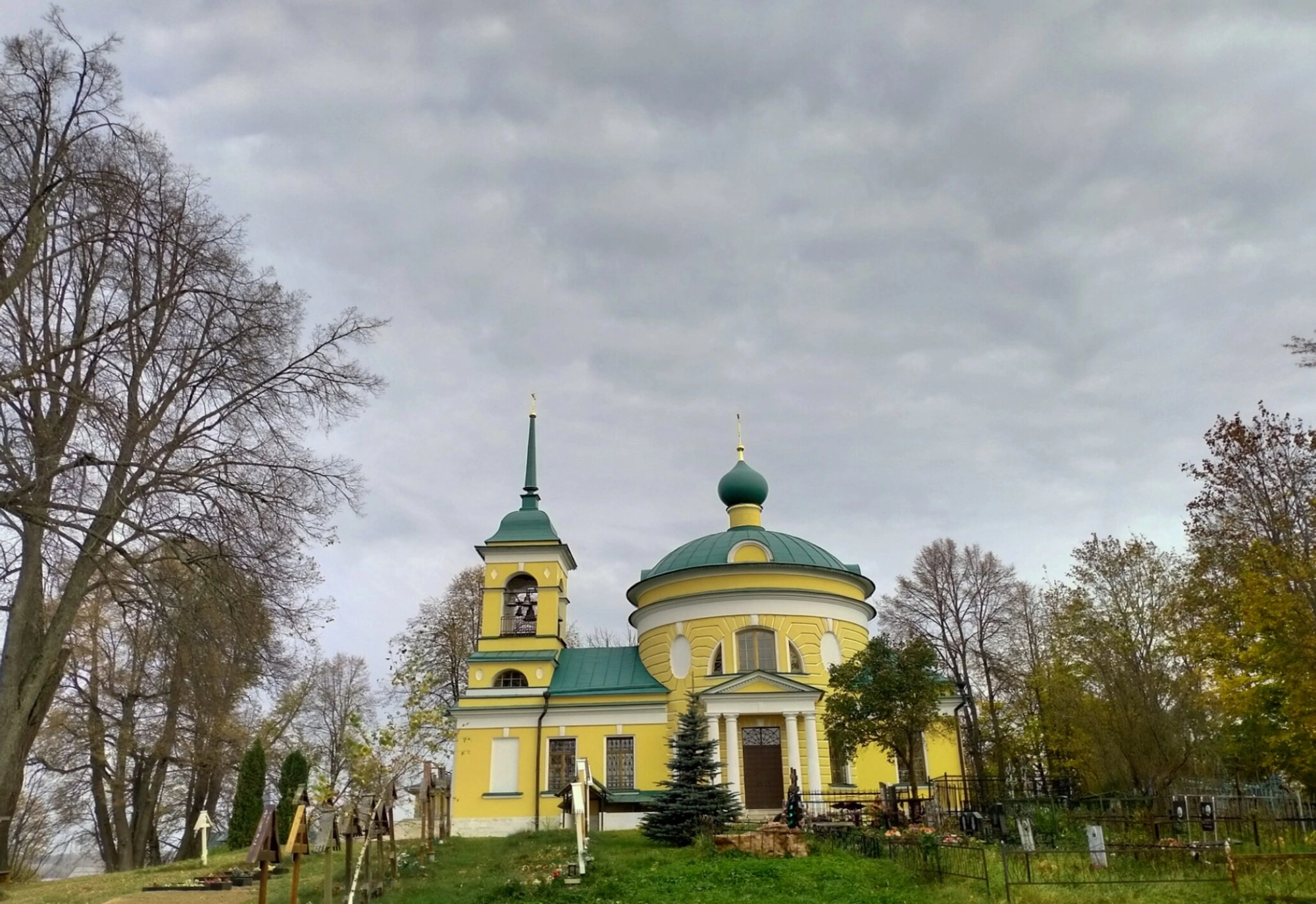 На фотографии можно наблюдать осенний пейзаж, окружающий храм. Деревья с пожелтевшей листвой создают особую атмосферу умиротворения и благоговения. Рядом со святыней располагается церковное кладбище, где нашли вечный покой многие православные христиане. Здание храма окрашено в традиционный желтый цвет, а крыши и купола — в зеленый, что символизирует вечную жизнь и надежду на спасение.