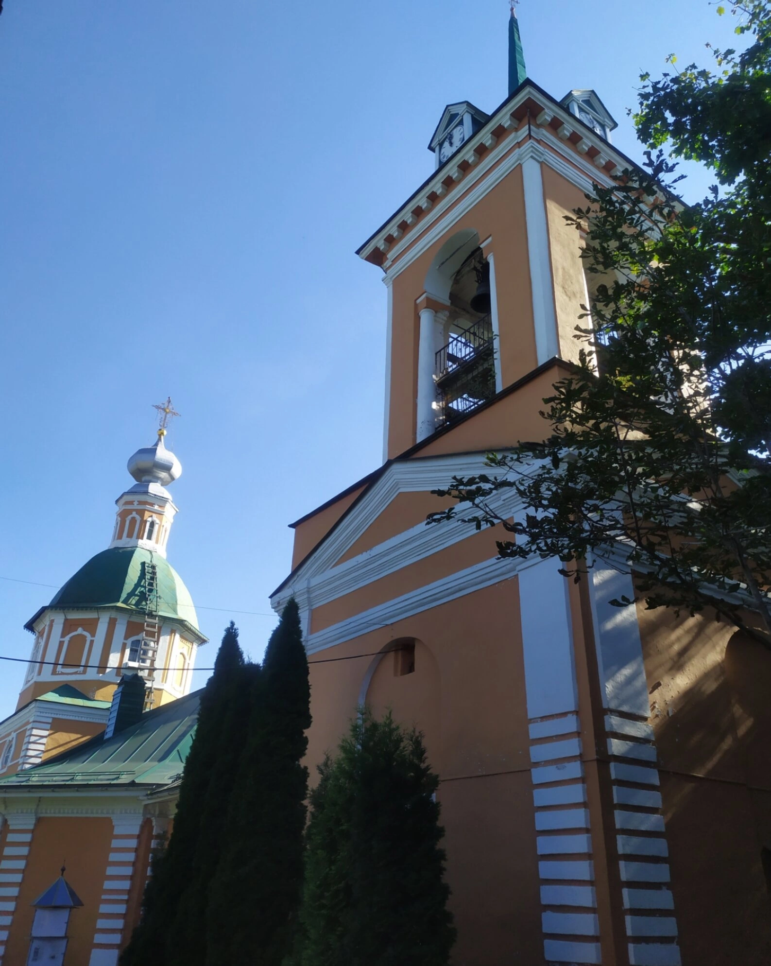 Трехъярусная колокольня, выполненная в персиковых тонах с белоснежными декоративными элементами, возносится к небесам. Верхний ярус, где размещены колокола, оформлен в виде открытой аркады с изящными белыми колоннами. Завершает колокольню четырехскатная крыша зеленого цвета, увенчанная небольшим шпилем с православным крестом, символизирующим веру и надежду.