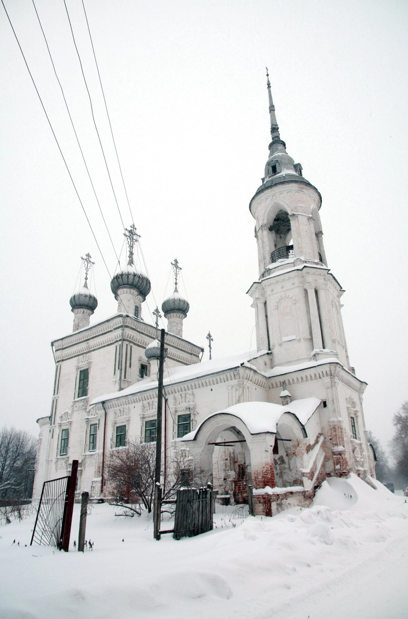 Храм был возведён в 1731–1735 годах на месте двух более древних деревянных церквей. Его строительство благословлено было в честь праздника Сретения Господня, символизирующего встречу Ветхого и Нового Заветов. Архитектура церкви представляет собой классический пример вологодского зодчества: мощный двусветный четверик увенчан пятиглавием, с востока к нему примыкает трёхчастная апсида, а с запада — трапезная и шатровая колокольня.
