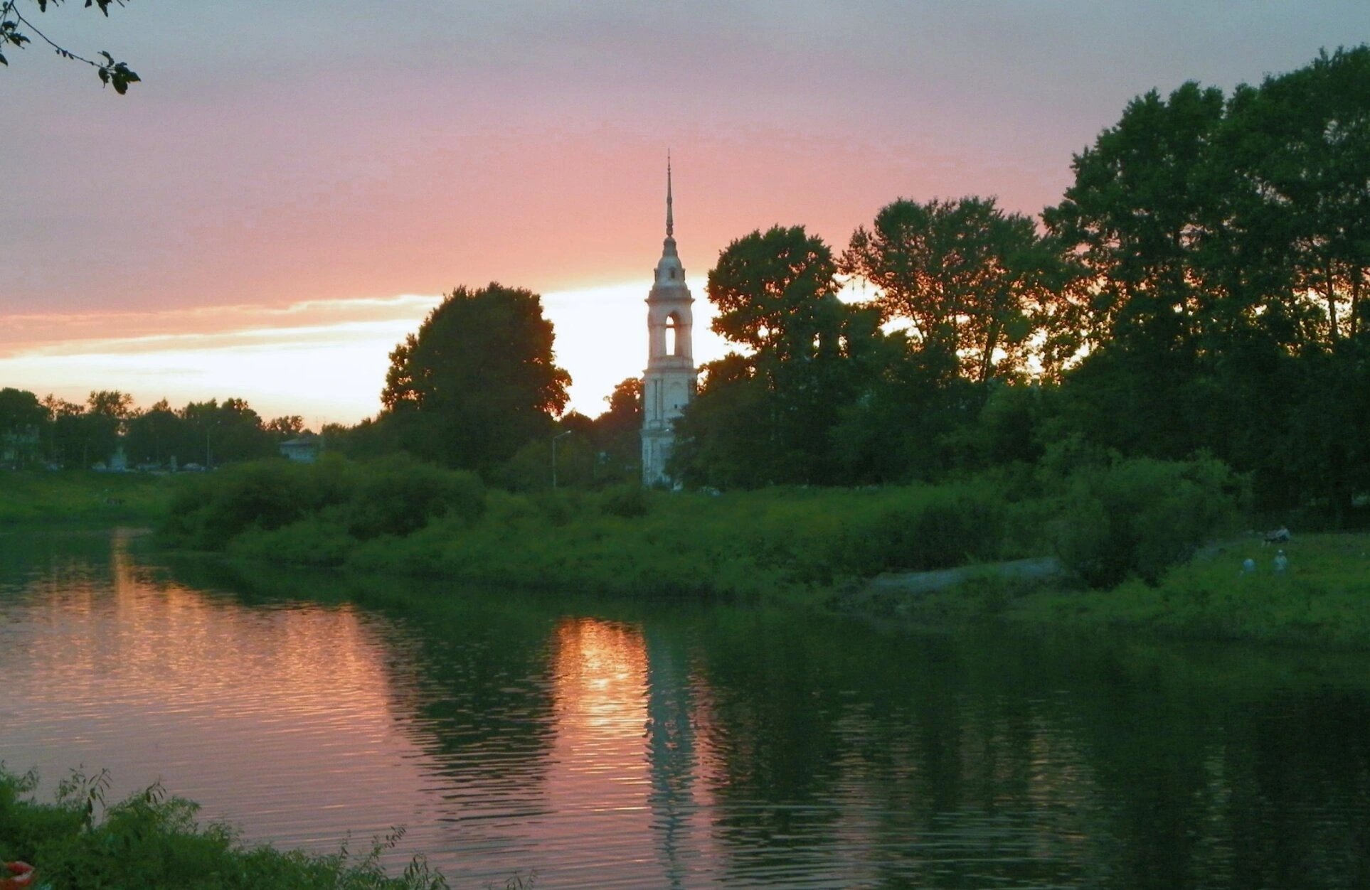 На фотографии запечатлён живописный закат над рекой в исторической части Вологды. В центре композиции возвышается колокольня Сретенского храма, чей стройный силуэт отражается в спокойной водной глади. Тёплые лучи заходящего солнца окрашивают небо в мягкие золотистые и багряные тона, создавая умиротворённую и благостную атмосферу.