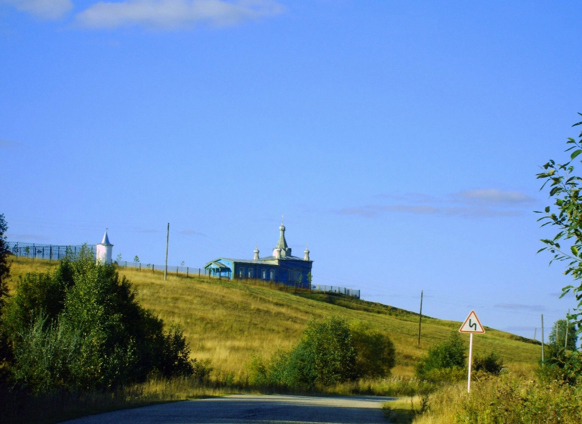 На фотографии запечатлён живописный сельский пейзаж, ведущий к одной из православных святынь Республики Коми — храму во имя святителя Стефана Пермского, расположенному в Ибском Серафимовском монастыре. Грунтовая дорога, уходящая вверх по холму, символизирует путь паломника к духовным вершинам. На вершине холма возвышается сам храм, увенчанный традиционными куполами, которые сияют под светом небесным.