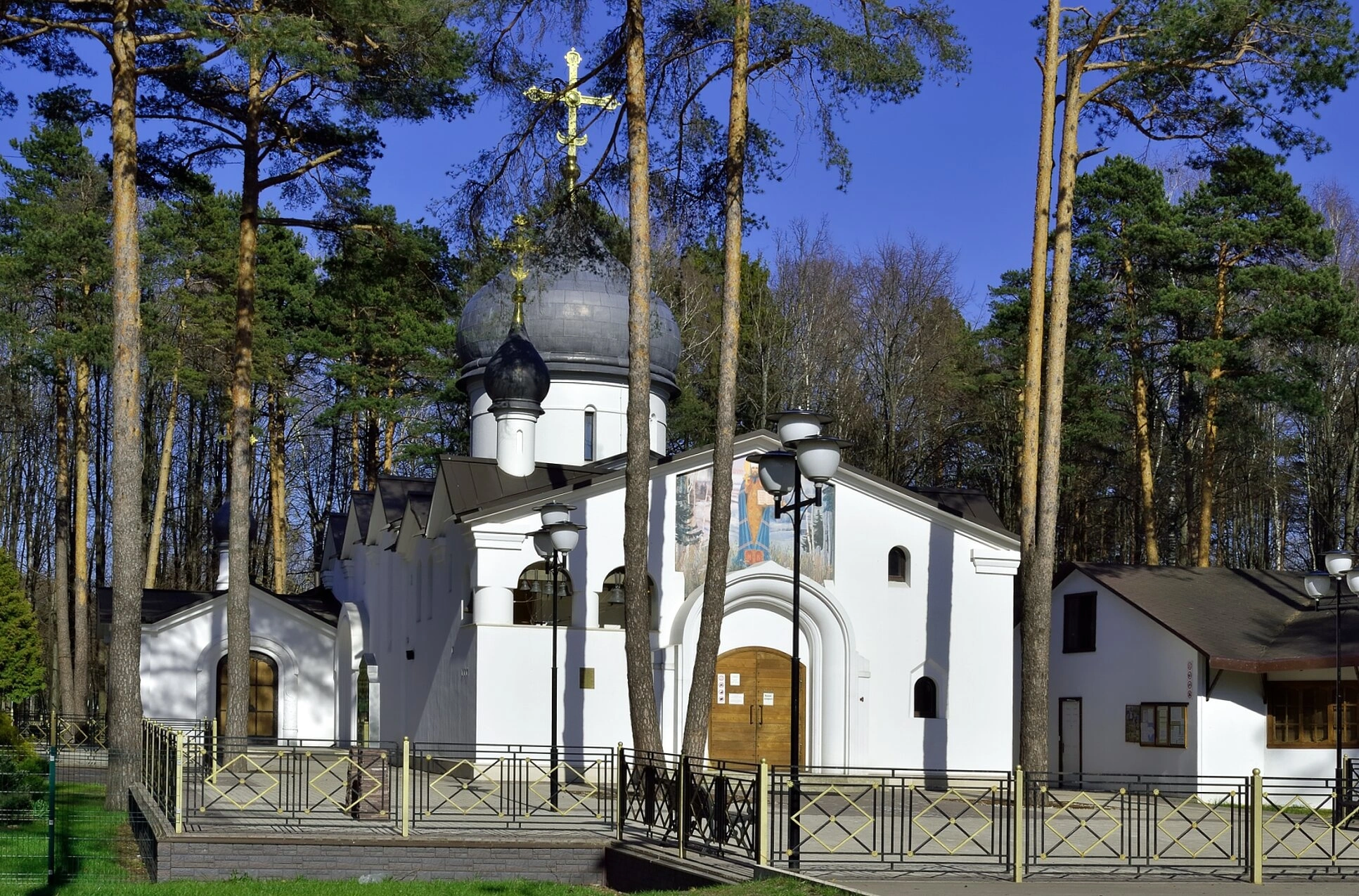 На представленной фотографии запечатлён храм в честь священномученика Владимира, митрополита Киевского и Галицкого, расположенный в подмосковном городе Королёве. Святыня возвышается среди вековых сосен, создающих благоговейную атмосферу уединённости и молитвенного покоя.