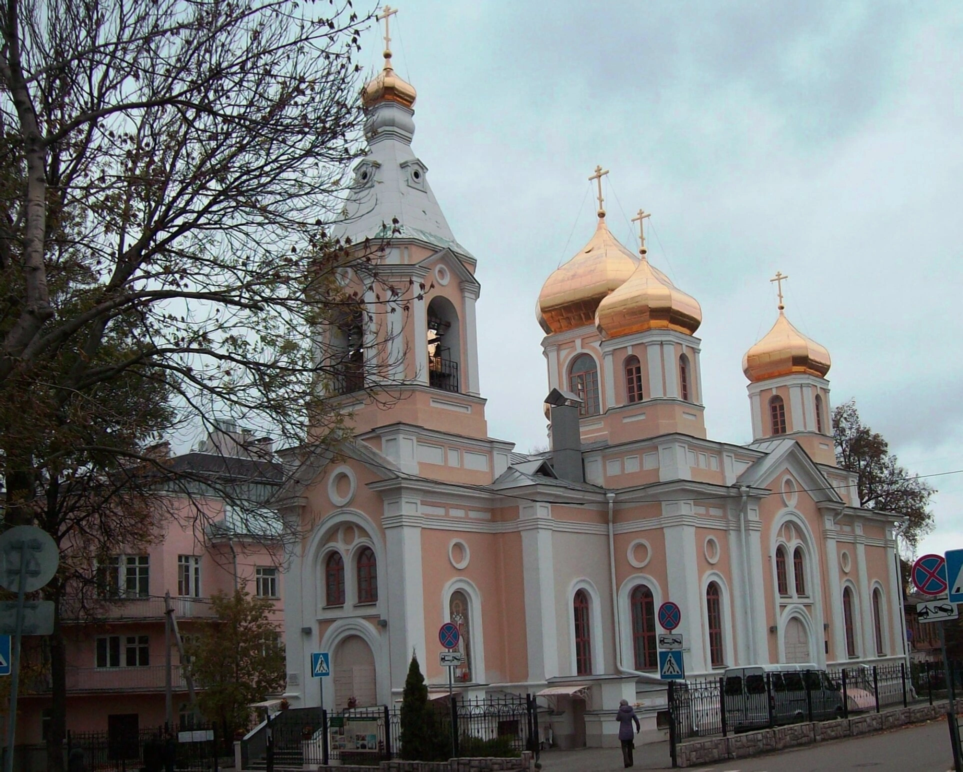 Храмовая территория благоустроена и ограждена. Снимок позволяет увидеть, что святыня находится в городской среде, гармонично сочетая вечное и земное. Дерево с редкой листвой, возможно, указывает на осеннее время, когда природа увядает, но благодать Божия пребывает вечно. Облачная погода и рассеянный свет создают особое, созерцательное настроение, позволяющее сосредоточиться на духовной красоте этого святого места.