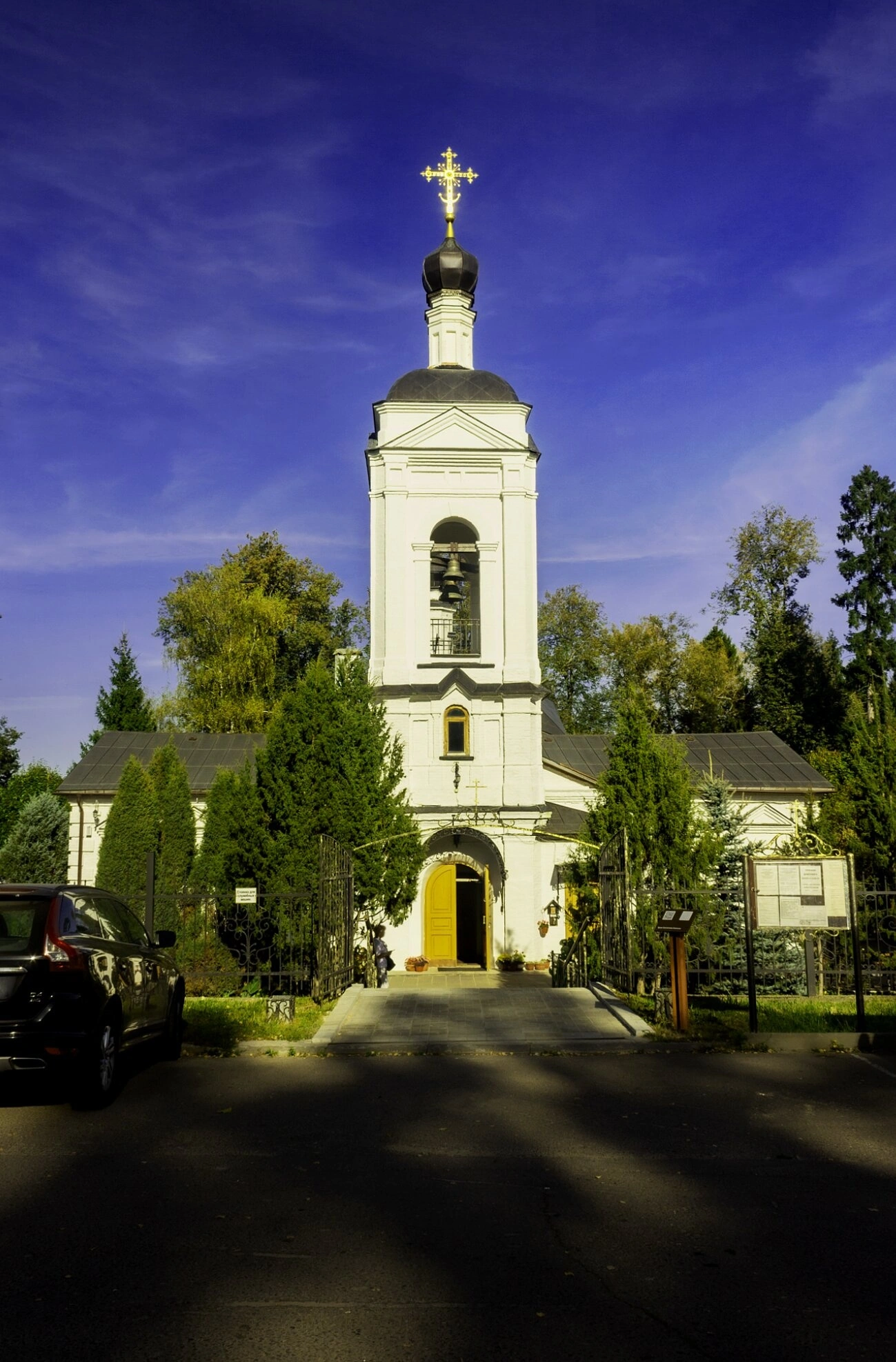 Белоснежные стены храма, увенчанные золочёными куполами, гармонично вписываются в живописный пейзаж подмосковной природы, создавая атмосферу благоговения и покоя. Фотография передаёт величие и красоту этой православной святыни, хранящей память о нескольких веках русской истории и духовности.
