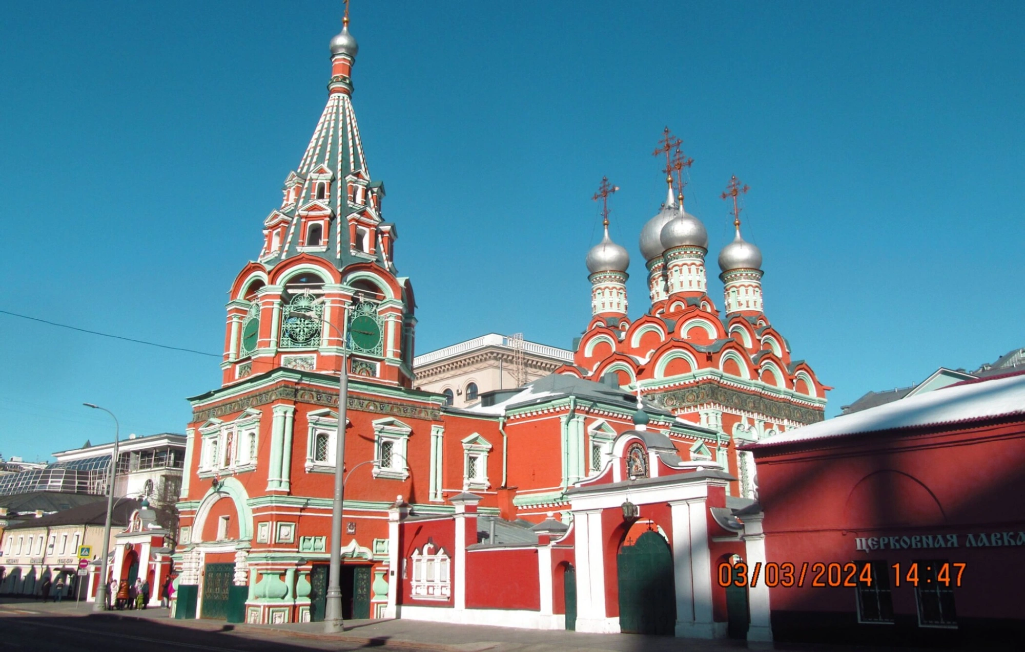 Снимок сделан в погожий зимний день. Искристый снег покрывает землю и крыши окружающих строений, а глубокое синее небо служит идеальным фоном, оттеняющим контрастное и жизнерадостное цветовое решение храма. На переднем плане видна часть кирпичной ограды, окрашенная в тон стенам. Храм предстаёт в безмятежной и светлой атмосфере, гармонично соединяя в себе вечную духовную красоту и изменчивое очарование зимней природы. Внушительный вид святыни напоминает о богатой истории этого намоленного места и продолжает привлекать взоры и сердца верующих и ценителей русского искусства.