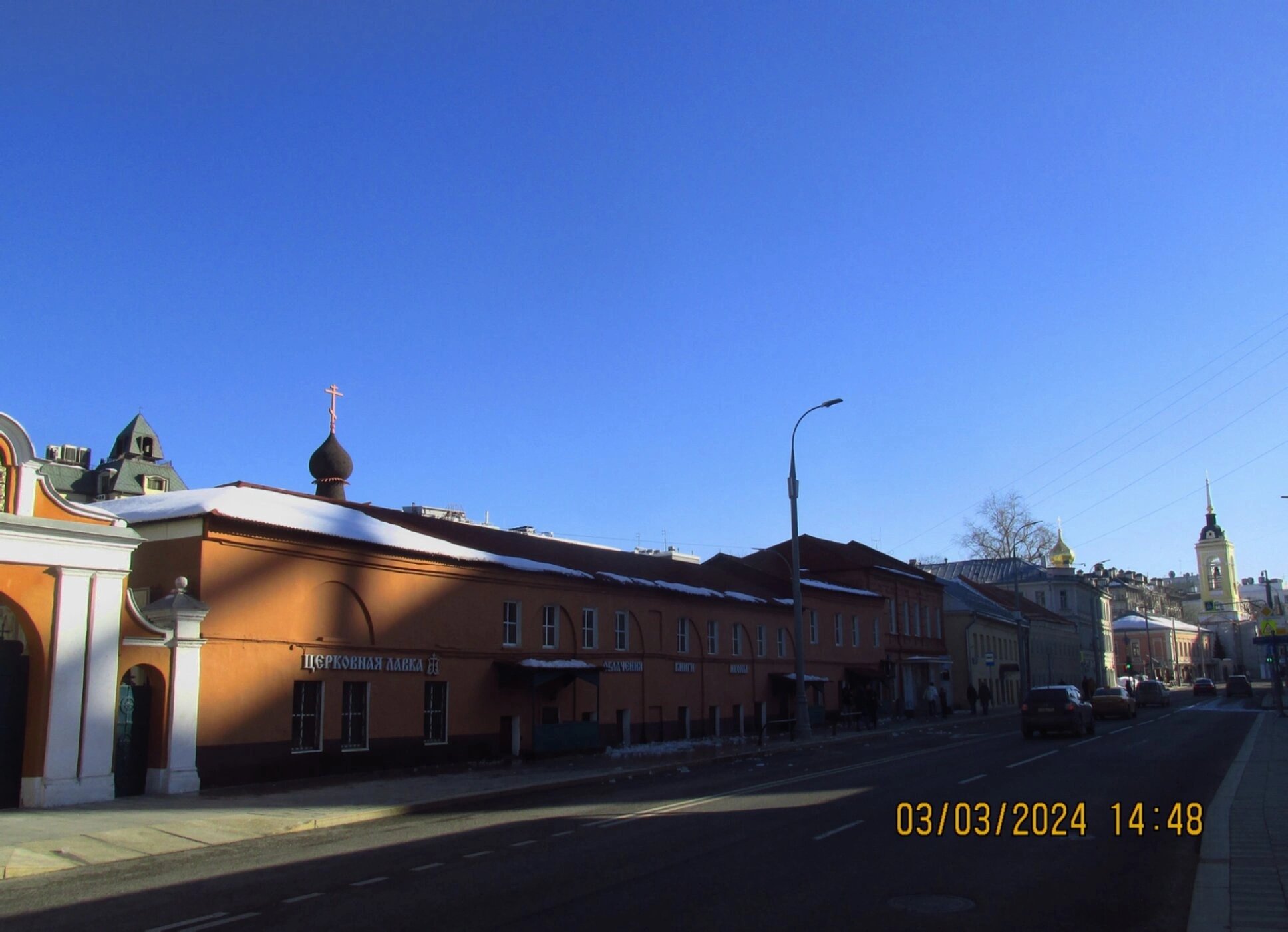 На представленной фотографии запечатлён благолепный вид на улицу Большую Полянку в Москве, где возвышается один из красивейших православных храмов столицы — храм Святителя Григория Неокесарийского в Дербицах. Снимок, сделанный в ясный день 3 марта 2024 года, открывает вид на историческую застройку Замоскворечья и архитектурную доминанту этой местности. На переднем плане справа от ворот расположено приземистое здание терракотового цвета, в котором размещается церковная лавка, о чём свидетельствует надпись на фасаде. За ним, в перспективе улицы, величественно возвышается основной объём храма, увенчанный луковичными главками с сияющими крестами.