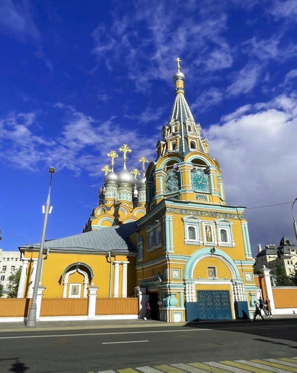 Храм располагается в историческом районе Якиманка, в непосредственной близости от оживлённой улицы, что подчёркивает его неразрывную связь с городской средой. На фотографии видно, что здание находится рядом с проезжей частью, что свидетельствует о его активной приходской жизни в современной Москве. Чистое голубое небо с облаками подчёркивает великолепие церковной архитектуры и создаёт светлое, возвышенное настроение.