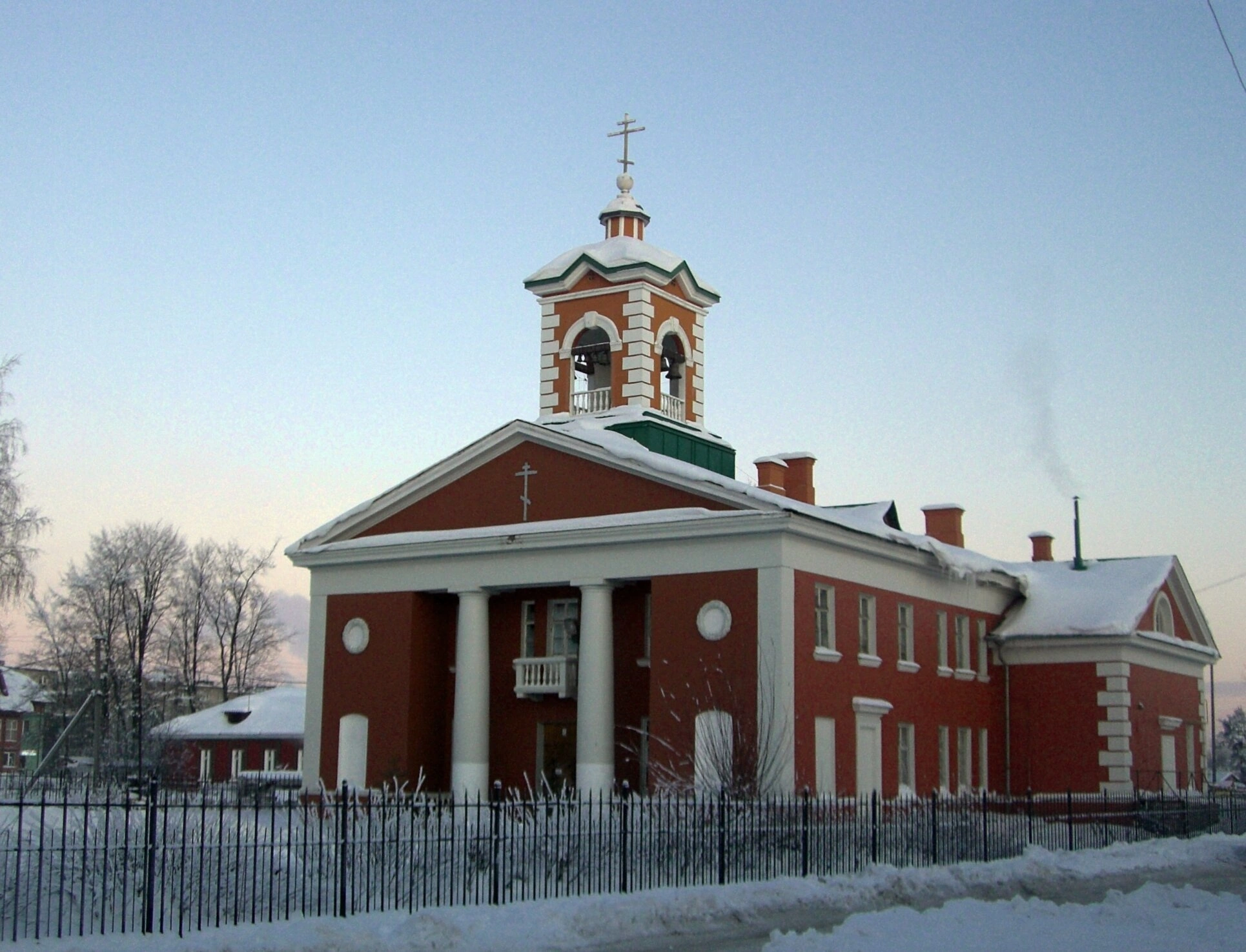 Здание храма, окрашенное в тёплый красный цвет, символизирующий торжественность и красоту православной веры, гармонично сочетается с белоснежными архитектурными деталями. Обрамляющие оконные проёмы колонны и изящные карнизы выполнены в классическом стиле, что придаётему облику строгость и величие. Над основной частью храма возвышается ярусная колокольня, увенчанная золочёным крестом, сияющим даже в зимнем небе.