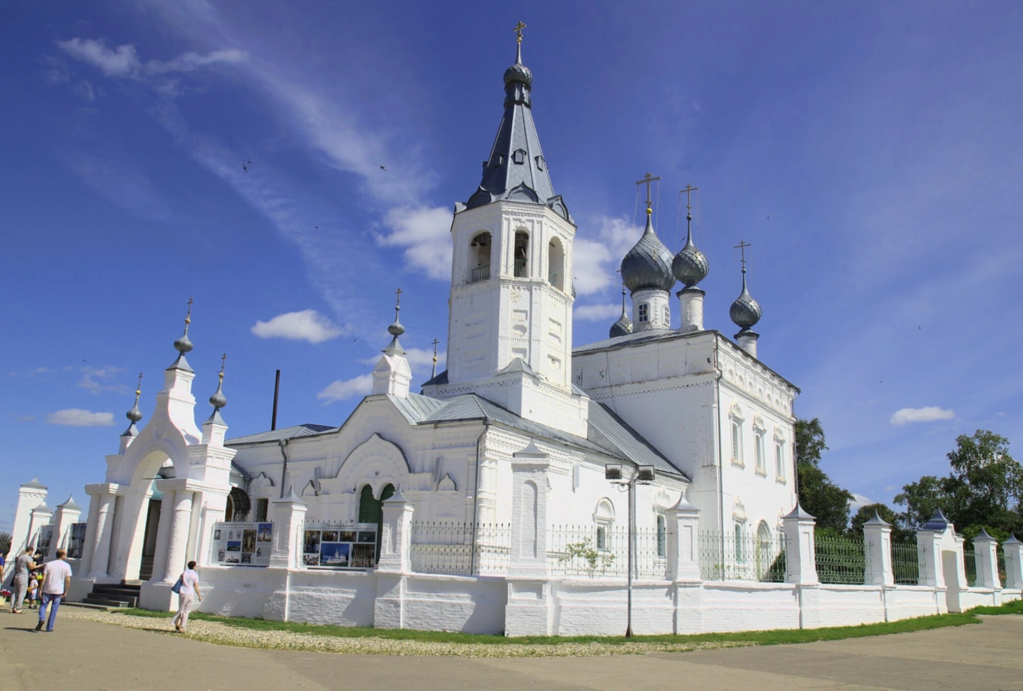 Белокаменный храм с зелёной кровлей и изящной колокольней представляет собой образец русской церковной архитектуры. На фотографии можно видеть его ухоженную территорию, что создаёт ощущение благодатного покоя и умиротворения. Стройный силуэт церкви, увенчанный куполами-луковками, гармонично вписывается в спокойный сельский пейзаж Ярославской земли.