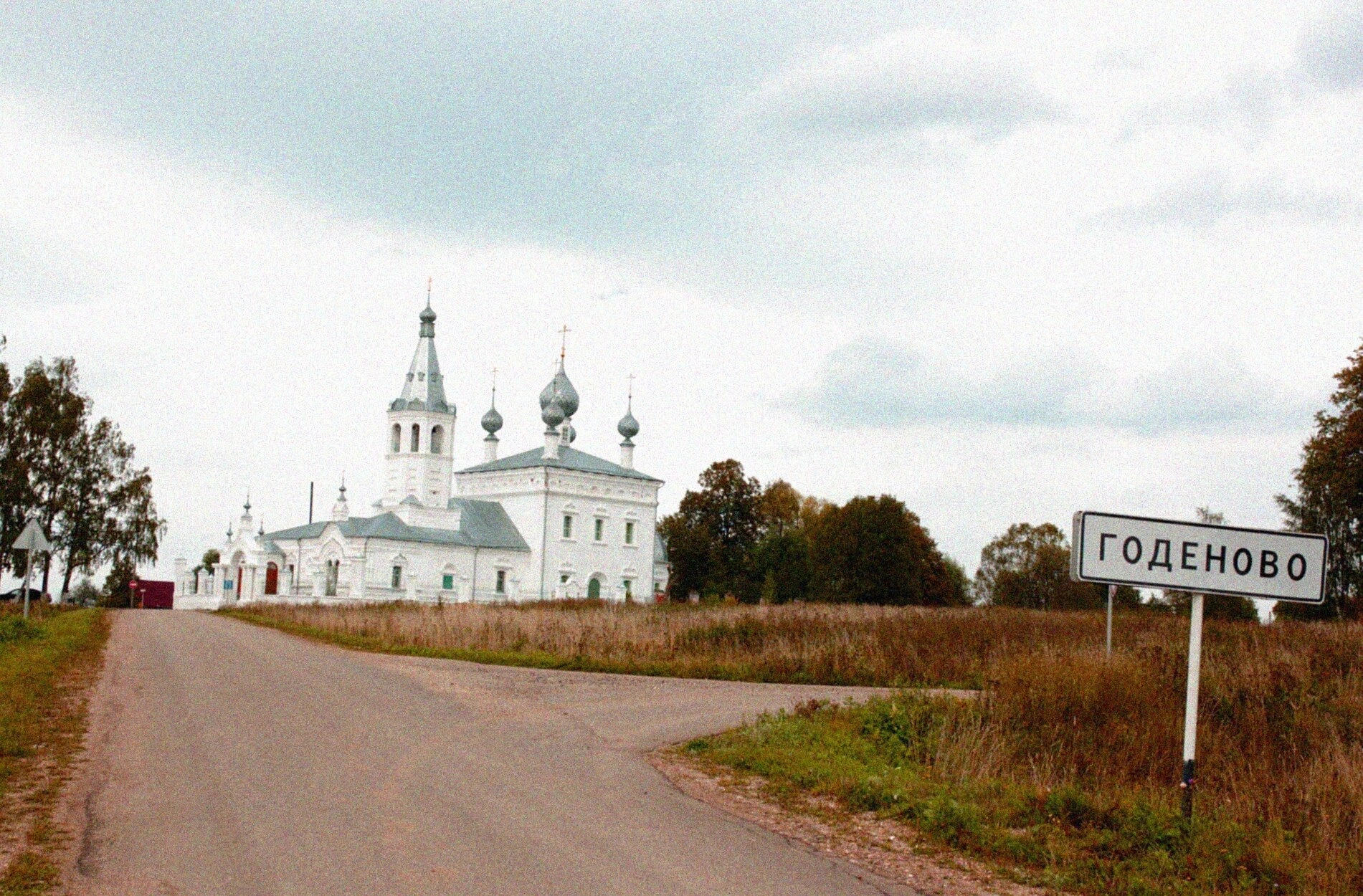Грунтовая дорога на переднем плане ведёт к святыне, приглашая паломников и странников. Указатель с надписью «ГОДЕНОВО» указывает путь к одной из главных духовных жемчужин России. Храм известен тем, что в нём пребывает величайшая святыня — Животворящий Крест Господень, чудесным образом явленный на этой земле в 1423 году. Это место притяжения для тысяч верующих, ищущих исцеления и утешения.