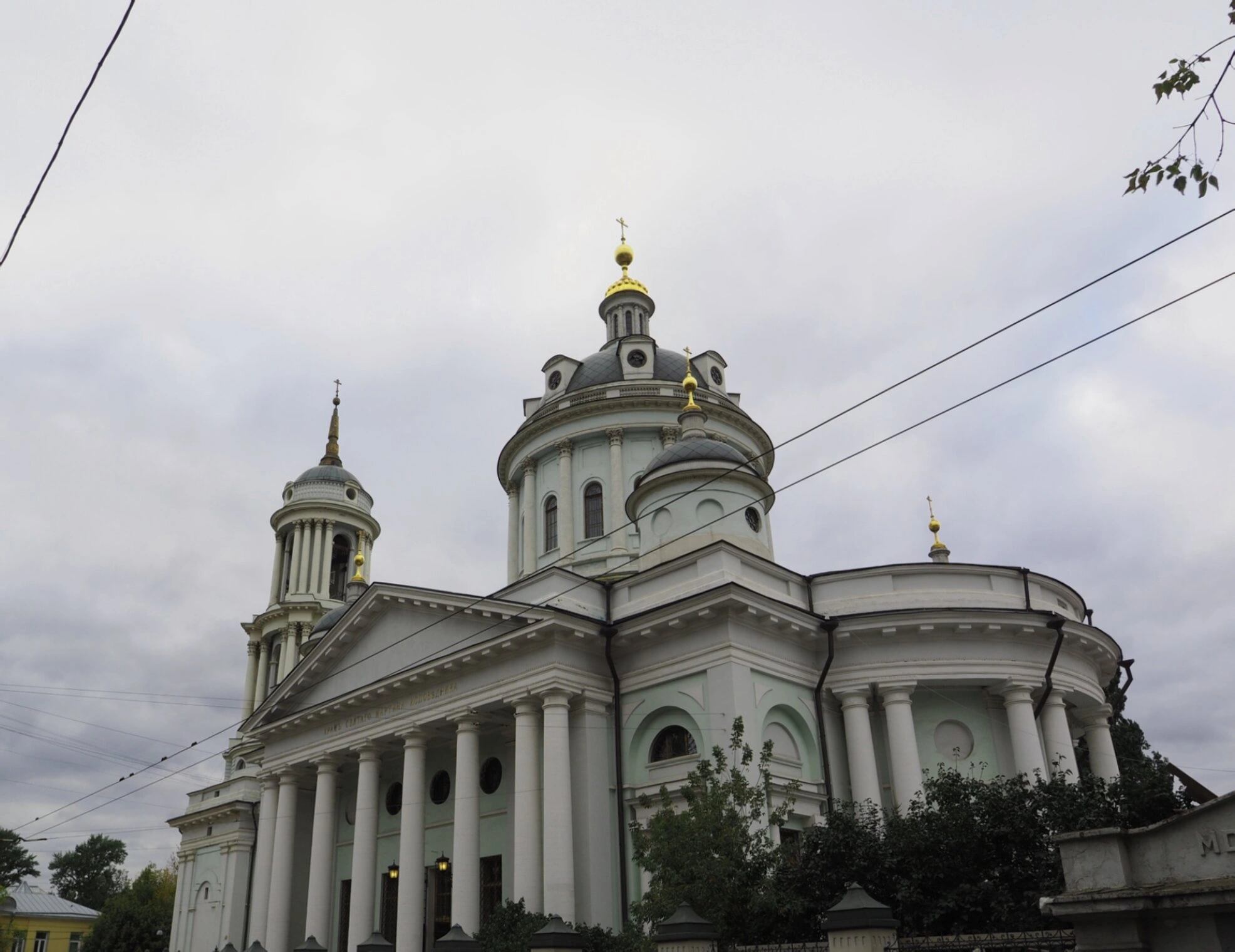 На фотографии запечатлён величественный храм во имя Святителя Мартина Исповедника, Папы Римского, расположенный в историческом районе Москвы — Алексеевской Новой Слободе. Этот православный храм является выдающимся памятником церковной архитектуры периода зрелого классицизма и объектом культурного наследия.