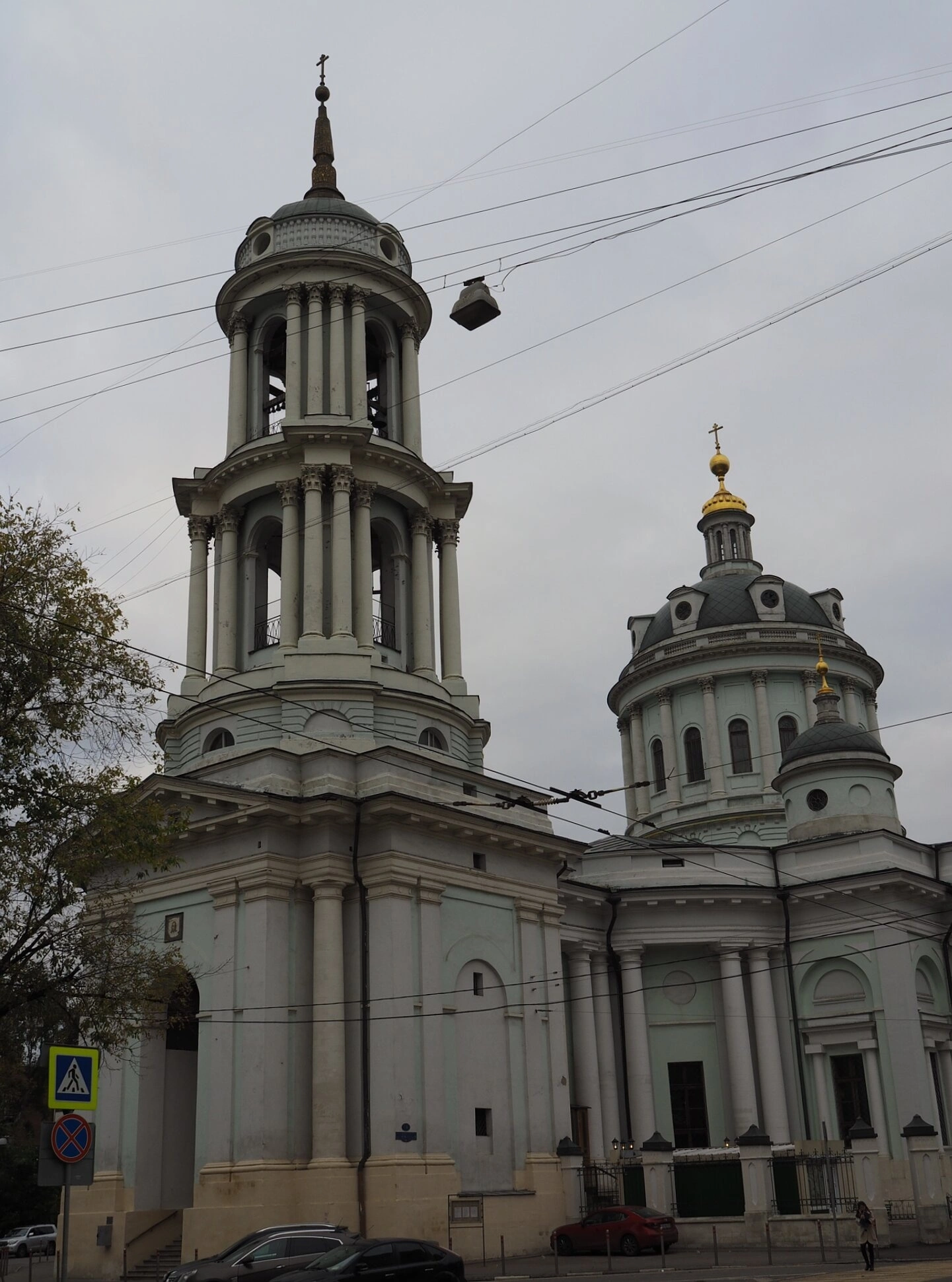 На переднем плане фотографии видна осенняя листва деревьев, обрамляющая святыню. Присутствие дорожных знаков и автомобилей свидетельствует о городском расположении храма, а провода над улицей напоминают о современном контексте существования исторического памятника. Храм Святителя Мартина Исповедника представляет собой не только место молитвы, но и важнейшую часть архитектурного наследия Москвы.