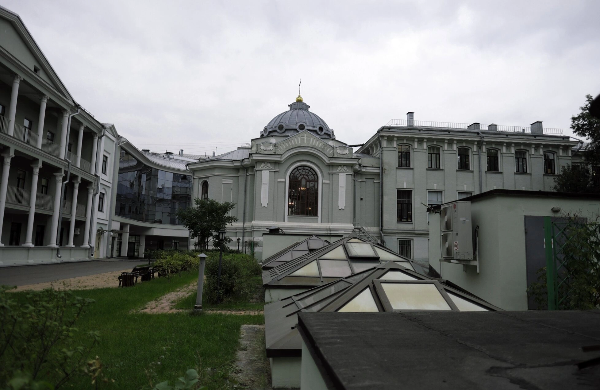 На фотографии запечатлён домовый храм во имя святителя Николая Чудотворца, расположенный по адресу: Москва, улица Фадеева, дом 5. Здание, выдержанное в серо-голубой цветовой гамме, увенчано куполом с установленным на нём крестом. Фасад украшают декоративная лепнина и арочное окно с витражом. Слева от храма видно современное строение со стеклянным фасадом, а справа — более традиционное многоэтажное здание. На переднем плане просматриваются стеклянные крыши технических сооружений, зелёные насаждения и скамейки. Снимок сделан в пасмурный день, небо покрыто серыми облаками. На фотографии отсутствуют люди, изображённые крупным планом.