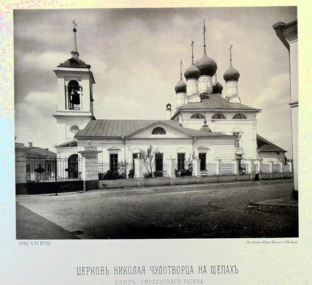 На исторической фотографии 1882 года, выполненной в рамках знаменитого альбома Найденова, запечатлён храм во имя Святителя и Чудотворца Николая, что на Щепах, в первопрестольной столице Москве. Сей святой храм расположен вблизи Смоленского рынка, в исторической местности, издавна известной как Щепы.