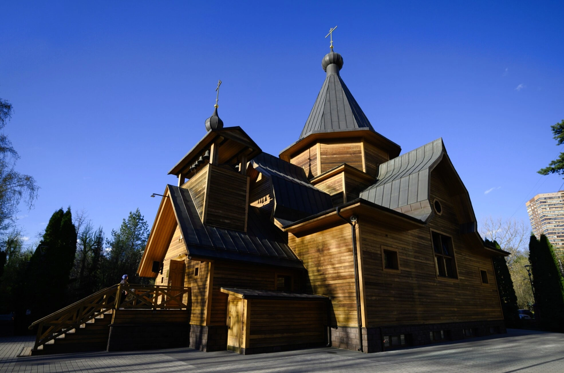 Вокруг храма разбита ухоженная территория с зелёными насаждениями и аккуратными дорожками, что создаёт атмосферу тишины и молитвенного уединения посреди городской суеты, о чём свидетельствуют виднеющиеся на заднем плане современные здания. Данная святыня является не только местом молитвы, но и важным духовным центром, напоминающим о непрерывности традиций и возрождении православной веры в России после периода гонений.