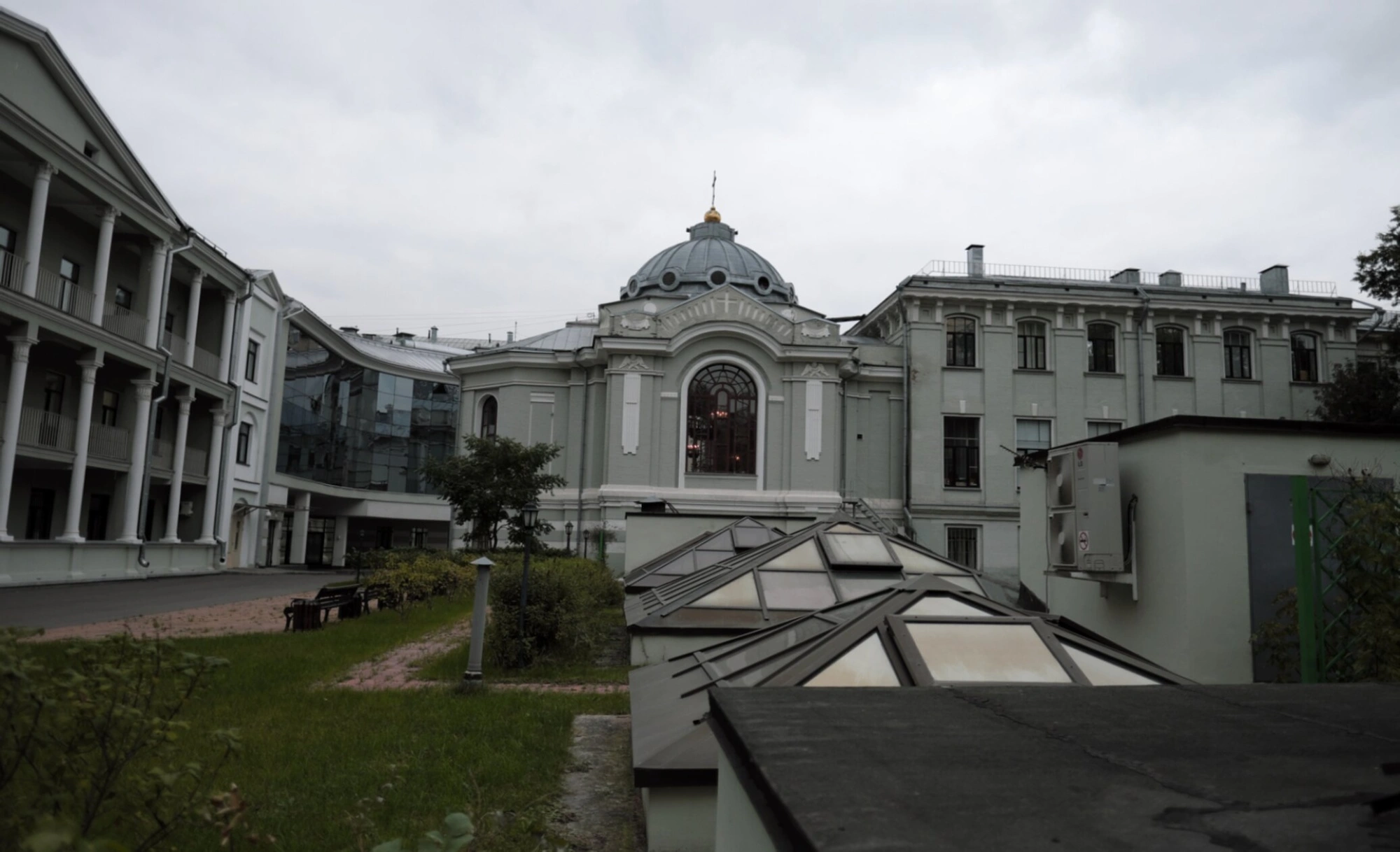 Доминирующим объектом кадра служит сам храм — серое купольное здание с большим арочным окном и декоративными элементами на фасаде. Купол, увенчанный православным крестом, зримо утверждает сакральный характер постройки. Слева от храма протянулось здание с классической колоннадой и современным стеклянным фасадом, а справа возвышается многоэтажный корпус с ритмичными рядами окон. На переднем плане, в правом нижнем углу, видна часть крыши с наклонными стеклянными световыми фонарями.