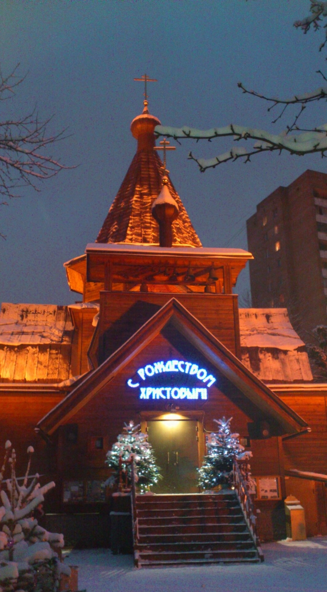 На фотографии запечатлён храм Святителя Николая Чудотворца, что у Соломенной Сторожки в Москве, в благолепии зимнего убранства. Снег покоится на ветвях окружающих деревьев и кровле храма, создавая атмосферу тихой и благоговейной зимней красоты. Храм украшен праздничной подсветкой, которая яркой неоновой надписью «С РОЖДЕСТВОМ ХРИСТОВЫМ» возвещает о великом христианском празднике.