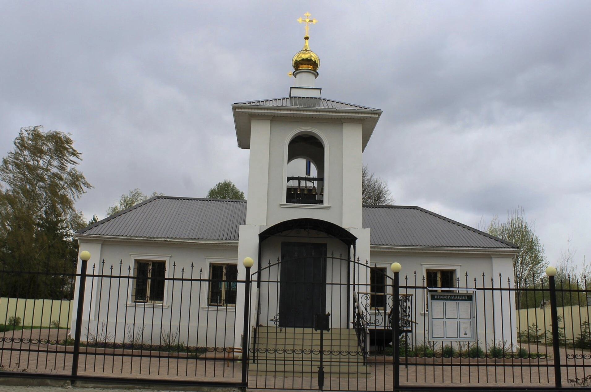 Белоснежное здание храма с тёмной кровлей и сияющим золотым куполом на колокольне представляет собой образец традиционного русского церковного зодчества. Стройная колокольня, увенчанная крестом, устремляется в небо, являя собой символ молитвенного предстояния. Святыня обнесена аккуратной металлической оградой, за которой виднеется ухоженная территория с деревьями.