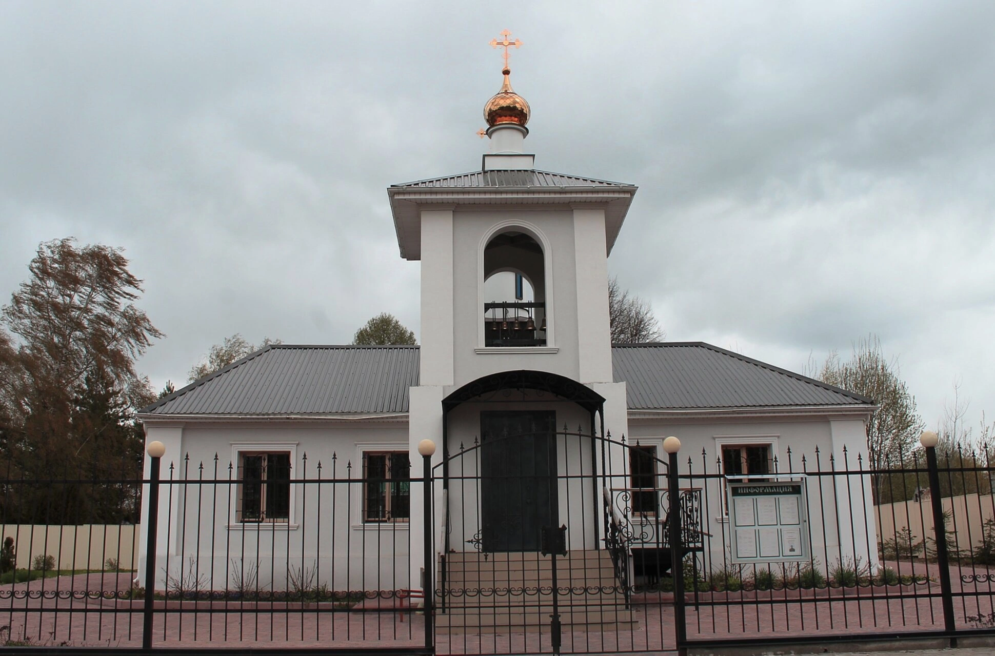 На фотографии можно видеть стройный четверик основного объёма храма, увенчанный изящной главкой, которая установлена на световом барабане. С восточной стороны к основному зданию примыкает полукруглая апсида, а с западной — трапезная часть и колокольня, составляющие единый ансамбль. Белоснежные стены храма контрастируют с тёмной кровлей и создают образ строгой и одновременно торжественной церковной архитектуры.