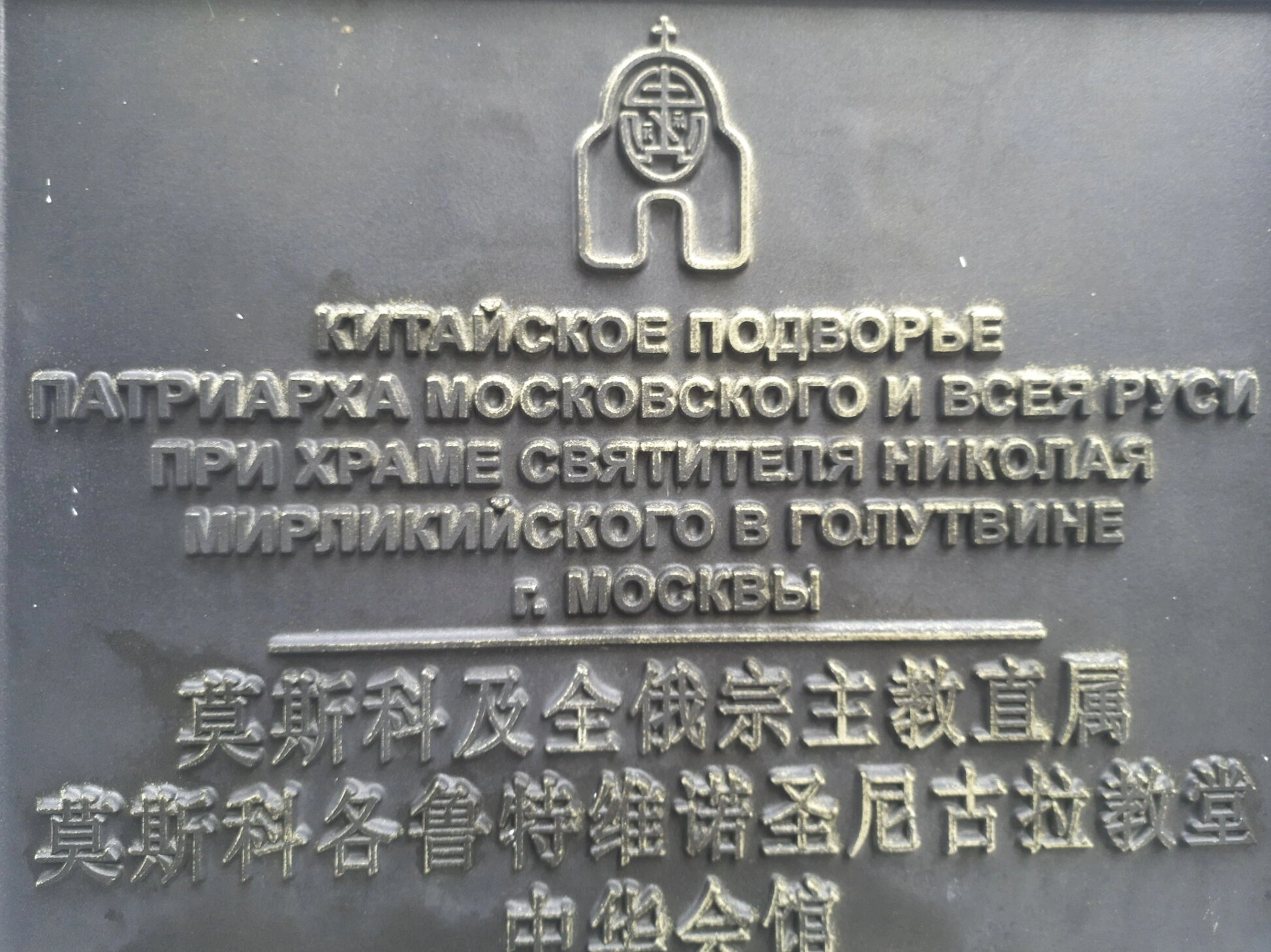 На представленной фотографии запечатлена металлическая информационная табличка, установленная на территории храма Святителя Николая Чудотворца в Голутвине. Данная табличка содержит сведения о статусе храма как Китайского подворья Патриарха Московского и всея Руси.