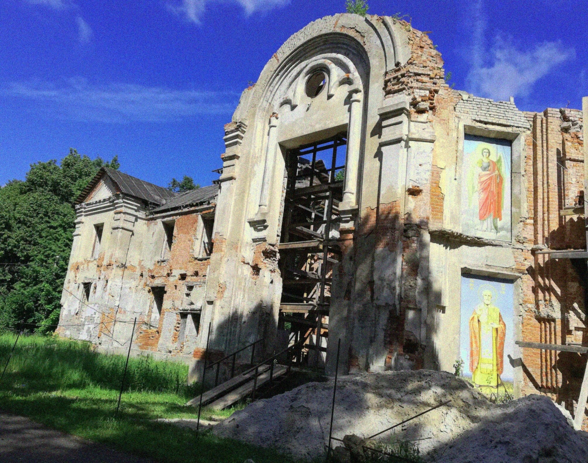 На фотографии видно, что храм находится в процессе восстановления. Несмотря на следы разрушений, заметны признаки проводимых реставрационных работ, что свидетельствует о постепенном возрождении былого благолепия этой святыни. Архитектура храма характерна для русской церковной традиции и представляет значительный интерес для ценителей православного зодчества.