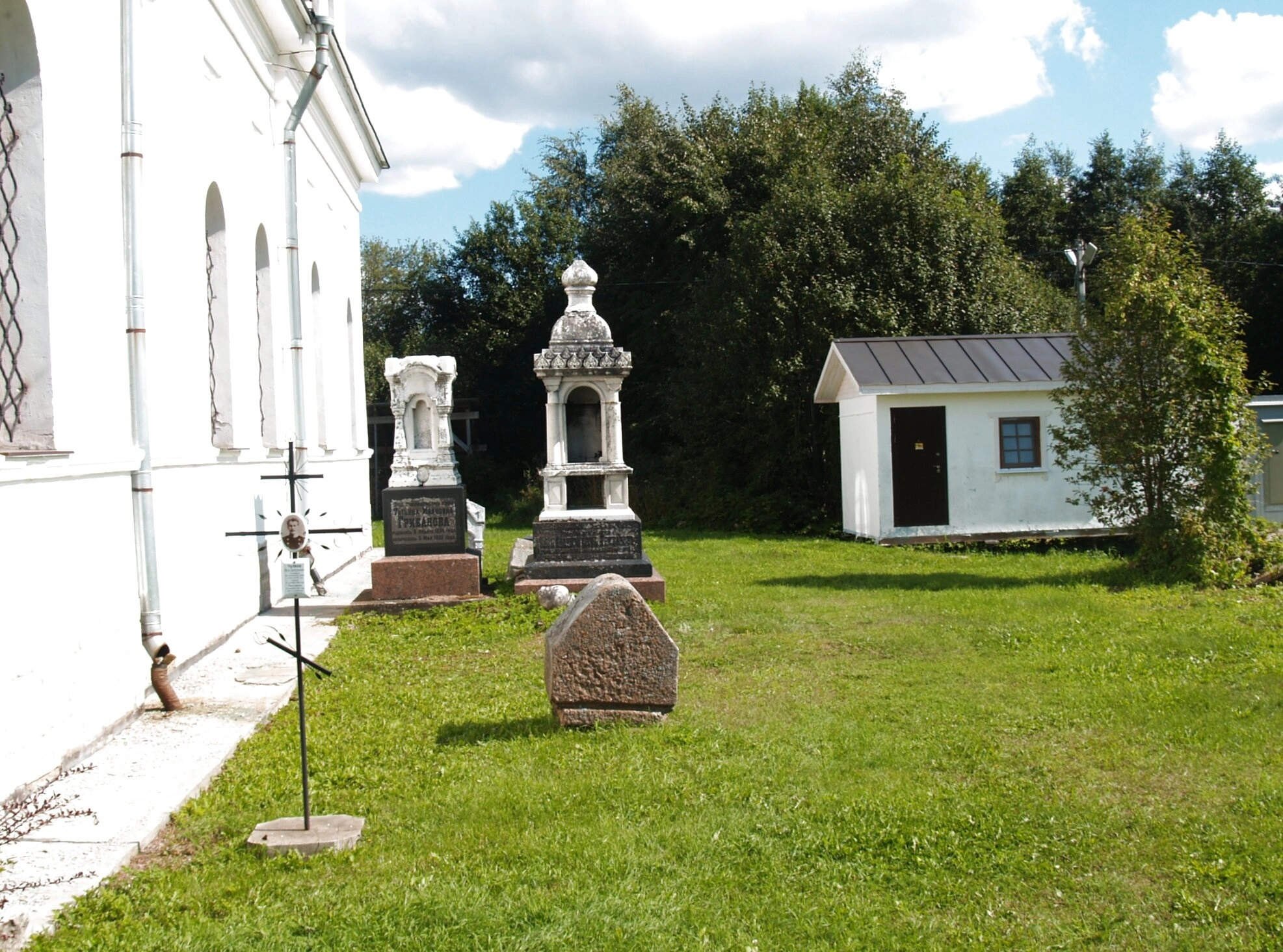 Перед храмом располагаются надгробные памятники и кресты, свидетельствующие о наличии захоронений на церковной территории. Один из памятников выполнен в форме обелиска, что характерно для мемориальных сооружений XIX столетия. Наличие этих памятников подчёркивает сакральный статус места и его значение как локации для поминовения усопших.