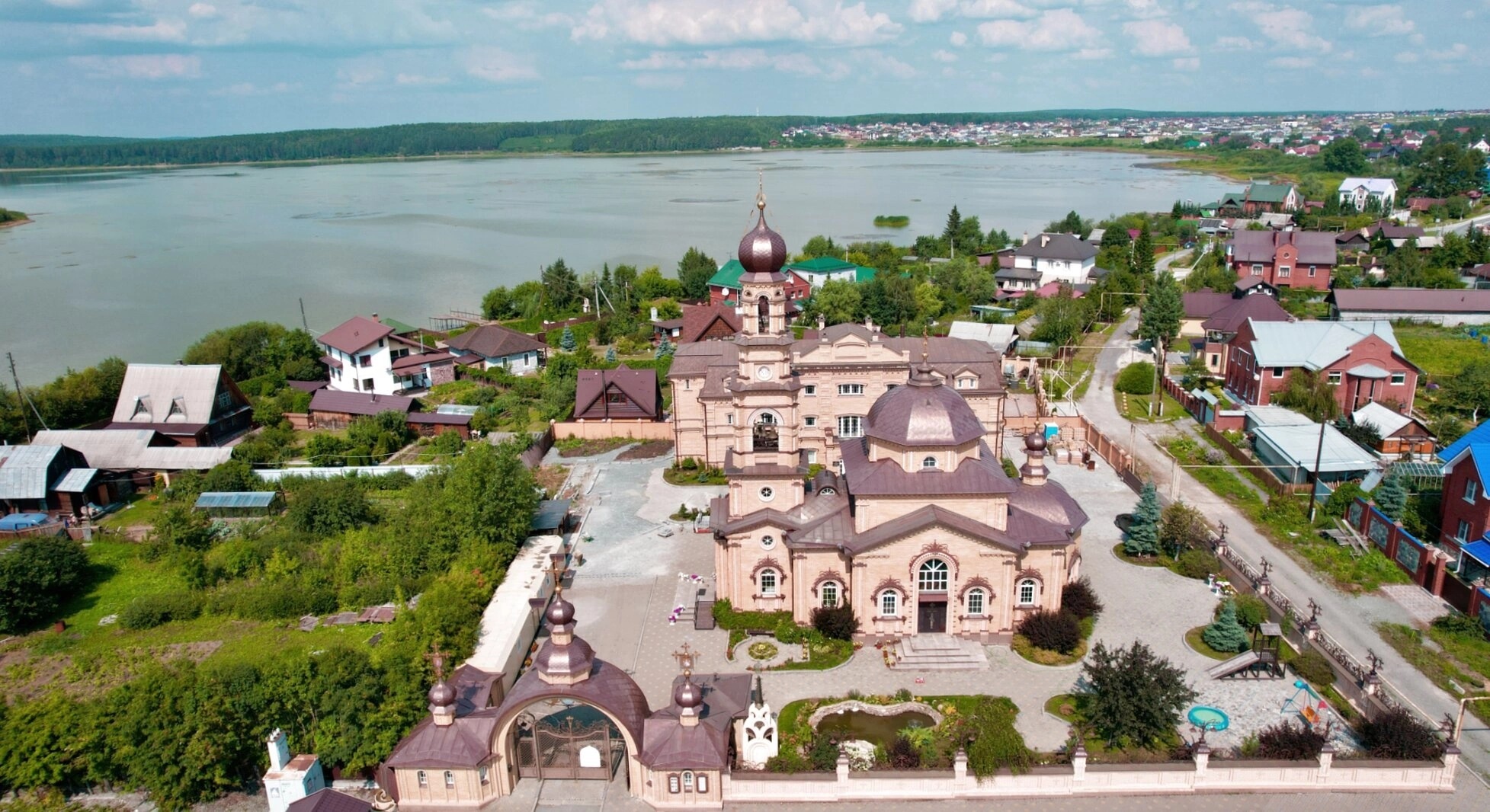За водной гладью, отражающей небесную лазурь и лёгкие облака, простирается жилая застройка посёлка Курганово. Храм, находящийся на возвышенном месте, духовно осеняет окрестные поселения, являясь центром религиозной жизни для местных жителей. Исторически подобные храмы на Урале становились не только местами богослужений, но и центрами образования, культуры и социального служения. Данная фотография передаёт особую благодатную атмосферу этого святого места, где небесная красота гармонично сочетается с земным устроением.