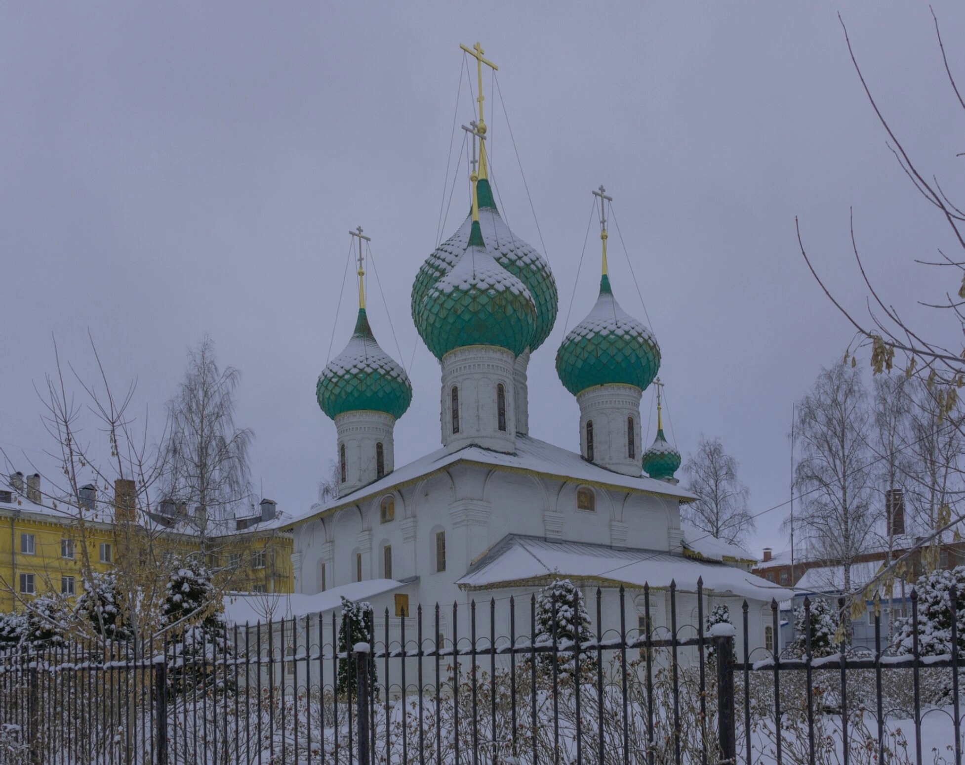 Архитектурный ансамбль храма включает в себя основной объем, увенчанный традиционным пятиглавием, и колокольню. Фасады здания украшены скромным, но изящным декором, характерным для ярославского зодчества. В зимнее время, запечатленное на снимке, храм приобретает особую, строгую красоту, напоминая о вечности и незыблемости православной веры.