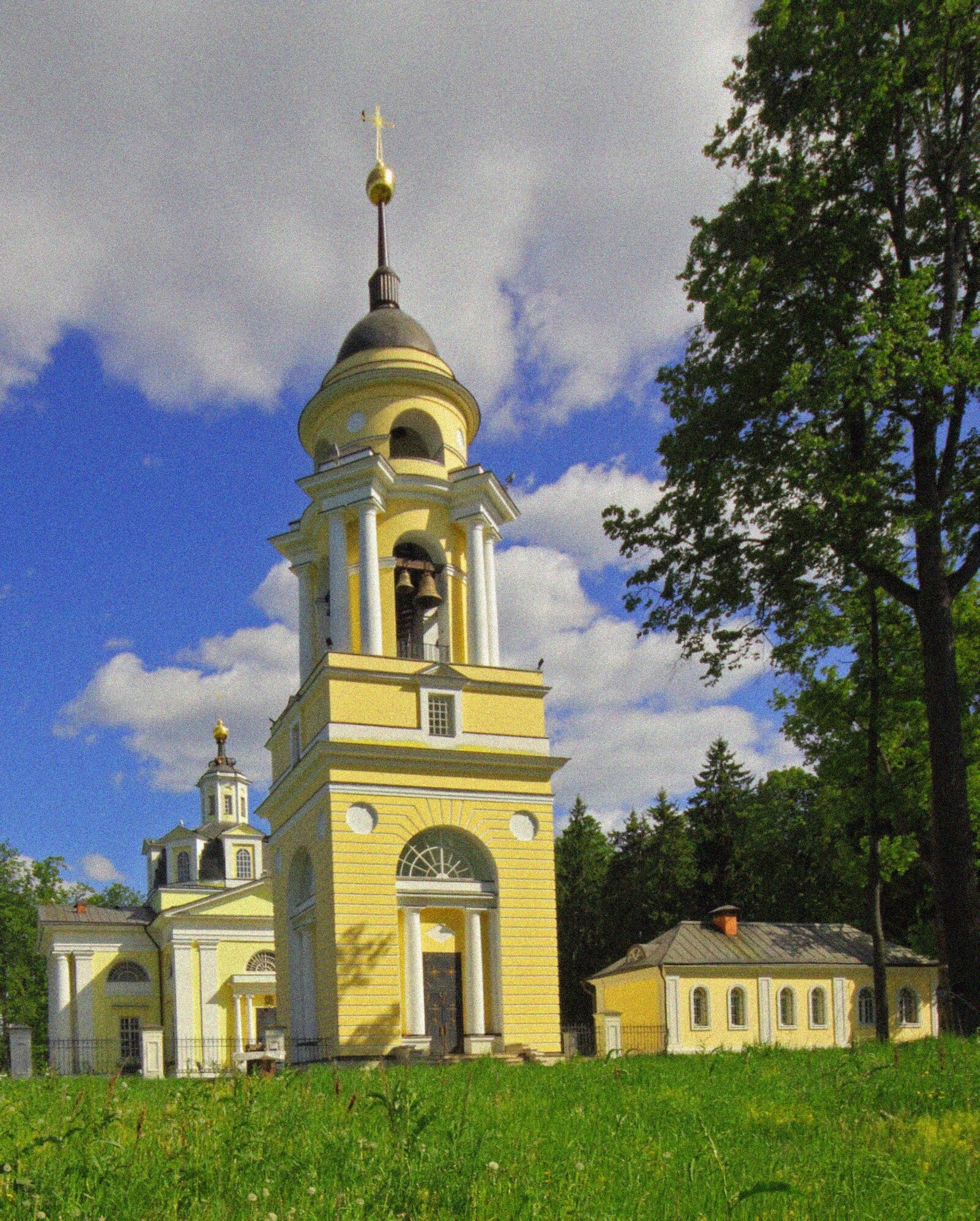 Церковь окружена ухоженной территорией с зелёными насаждениями, что указывает на её сохранность и действующий статус. Ясный солнечный день и лазурное небо с лёгкими облаками подчёркивают величие архитектурных форм и деталей, позволяя рассмотреть всю красоту православной святыни. На заднем плане просматриваются другие строения, исторически входившие в комплекс усадьбы Прозоровских.