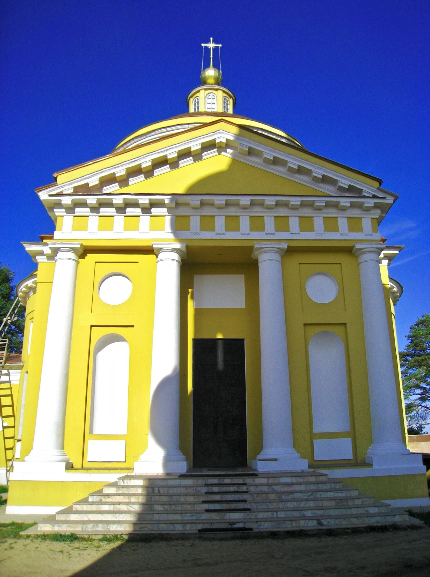 Архитектурный облик храма отличается монументальностью и благородной простотой. Основной объём представляет собой двусветную ротонду, увенчанную сферическим куполом с главкой и крестом. С восточной стороны к ротонде примыкает полукруглая апсида, а с западной — трапезная и трёхъярусная колокольня, завершённая высоким шпилем. Фасады здания украшены пилястрами и фигурными наличниками.