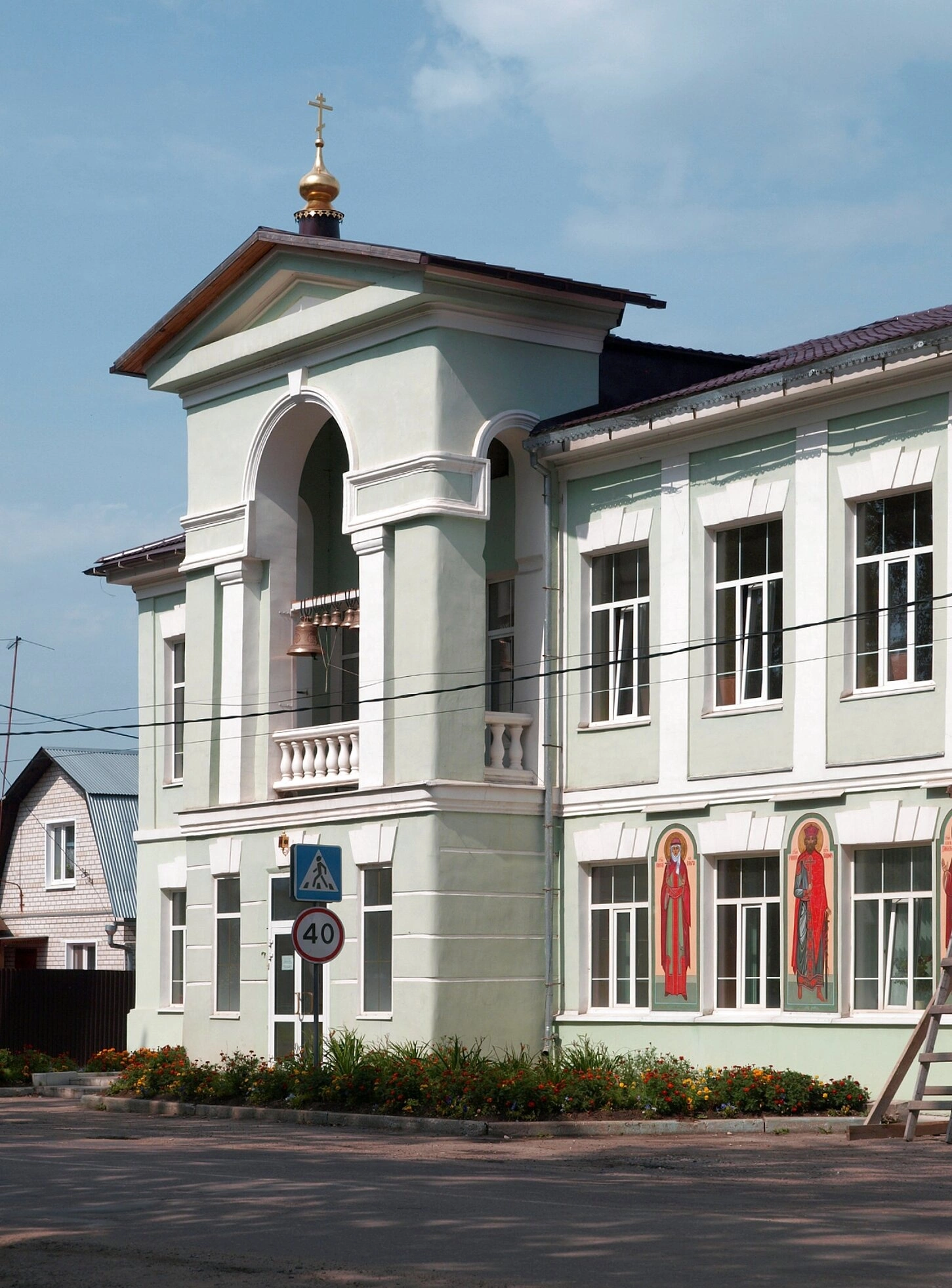 На фасаде здания внимательный взгляд различит святые образы, размещённые в киотах и на стенах, что является особенностью убранства данной святыни. Перед храмом разбиты ухоженные клумбы с цветами, символизирующие райский сад и приумножающие благолепие места. На переднем плане виднеются элементы современной градской инфраструктуры, которые, однако, не нарушают благоговейной и намоленной атмосферы, окружающей дом Божий.