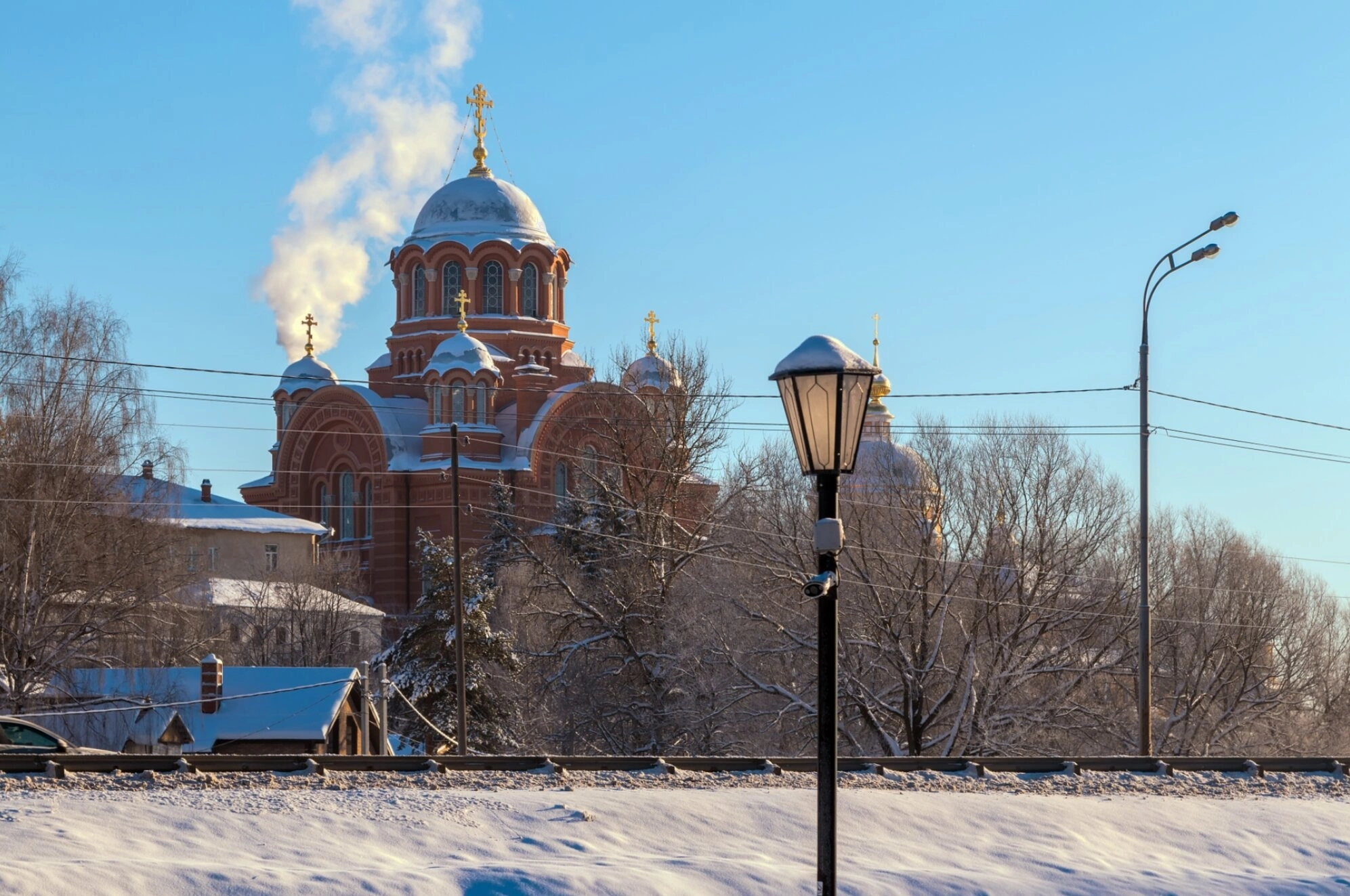 Зимнее убранство подчёркивает благоговейную тишину и строгую красоту монастырской жизни. Белый снег, покрывший землю и ветви деревьев, символизирует чистоту и непорочность, напоминая о духовном предназначении этого места. Архитектура храма, с его устремлёнными в небо куполами, увенчанными златоглавыми крестами, ярко выделяется на фоне небесной лазури, являя собой образ горнего мира и молитвенного предстояния.