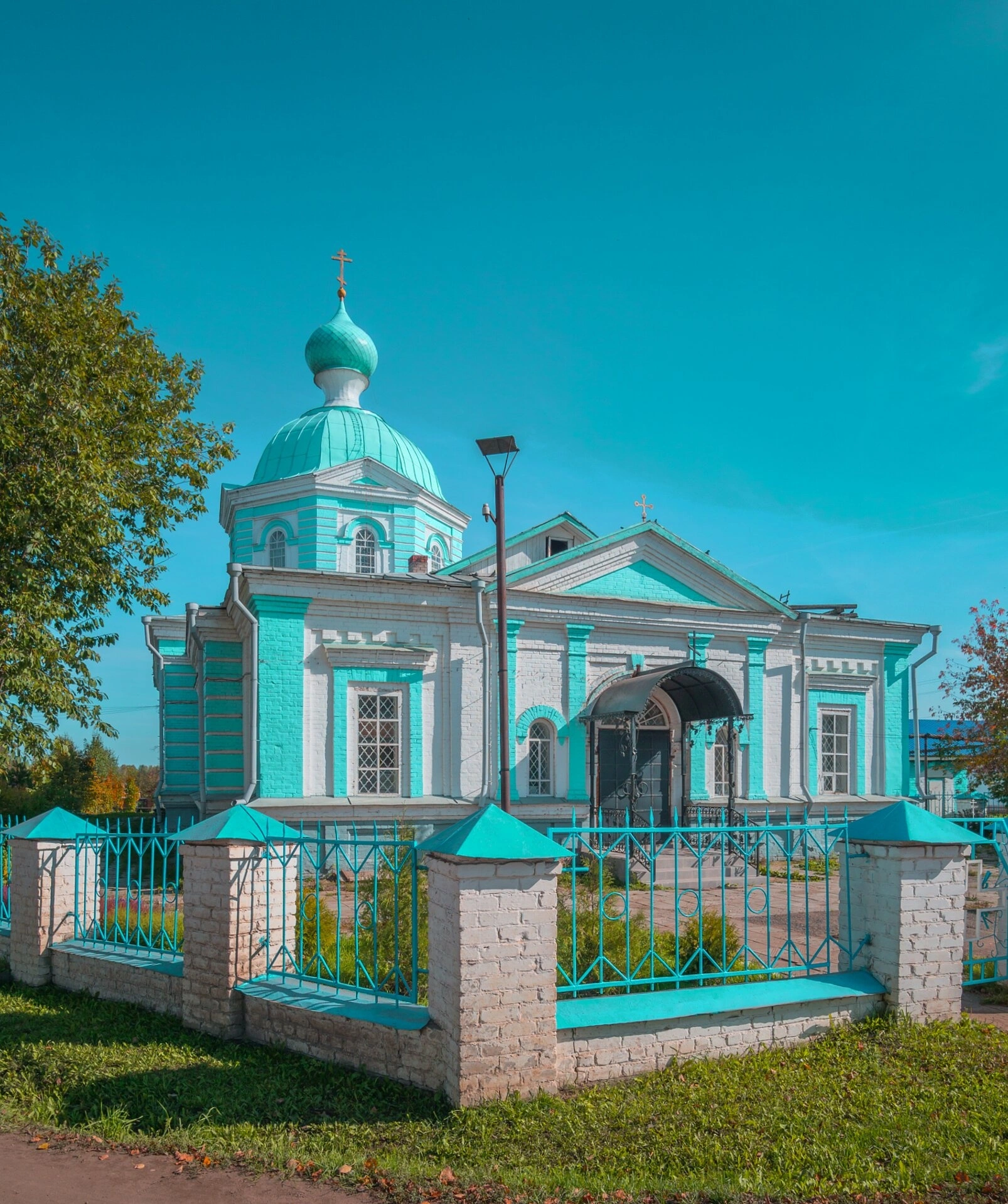 Территория вокруг храма благоустроена и ограждена аккуратным забором, что подчёркивает особый статус этого места. На переднем плане фотографии видна зелёная растительность, включая раскидистое дерево, что создаёт ощущение уюта и гармонии между творением рук человеческих и природной красотой. Небо в момент съёмки было ясным и безоблачным, добавляя снимку светлое и возвышенное настроение.