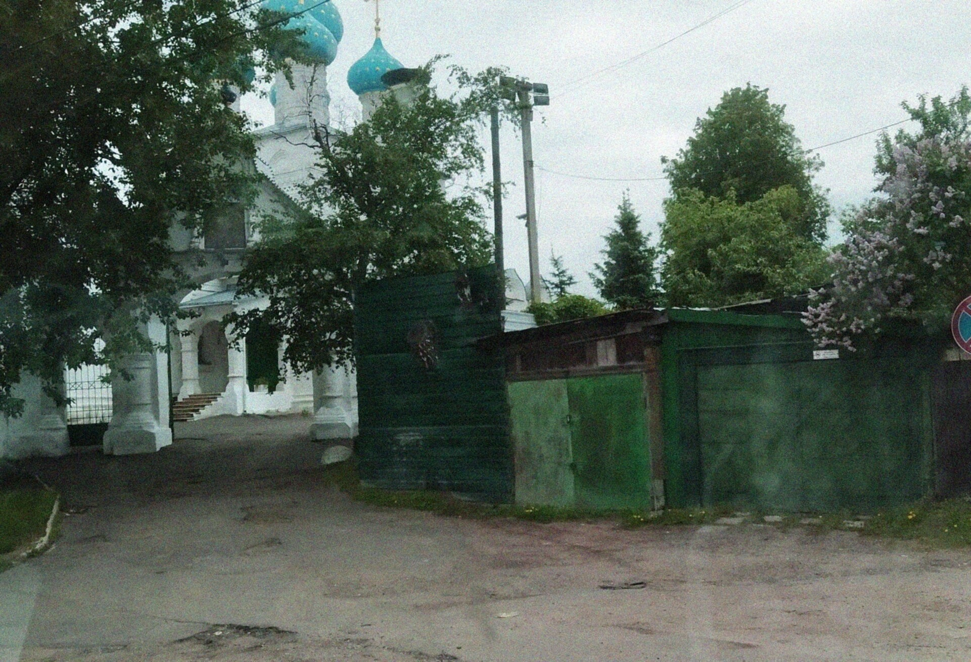 Рядом с церковью виднеются ухоженные деревья, часть ограждения территории и вспомогательные постройки, характерные для церковного подворья. На переднем плане обращает на себя внимание дорожный знак, ограничивающий сквозной проезд, что способствует сохранению молитвенной тишины и спокойствия на территории храма.