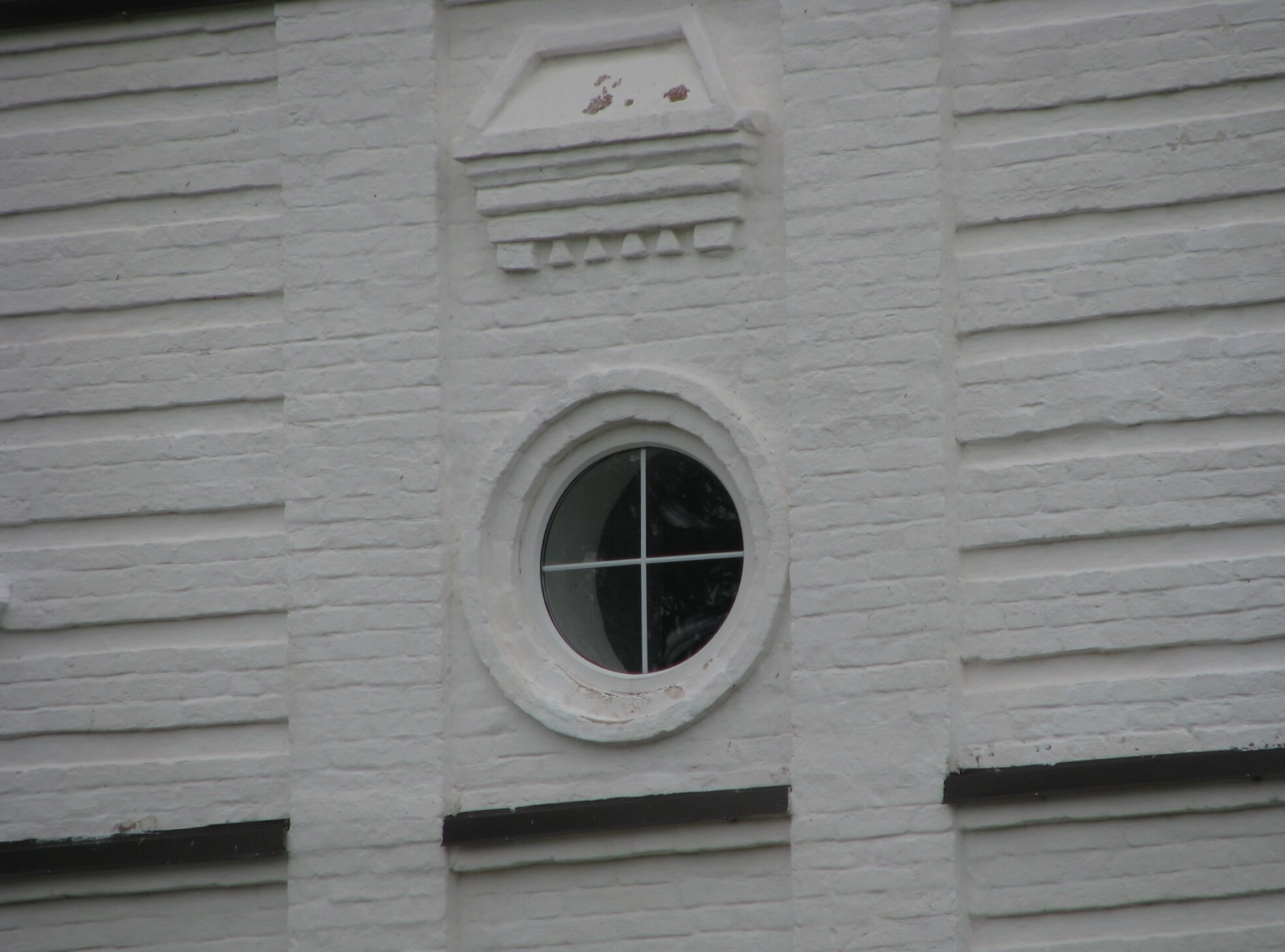 В центре композиции располагается глухое круглое окно, обрамлённое простым наличником. Подобные окна, именуемые в архитектуре «люкарнами», характерны для храмового строительства и несут не только декоративную, но и символическую нагрузку, олицетворяя собой всевидящее око Божие. Переплёт внутри окна, разделяющий его на четыре сегмента, образует крест — главный символ христианской веры.