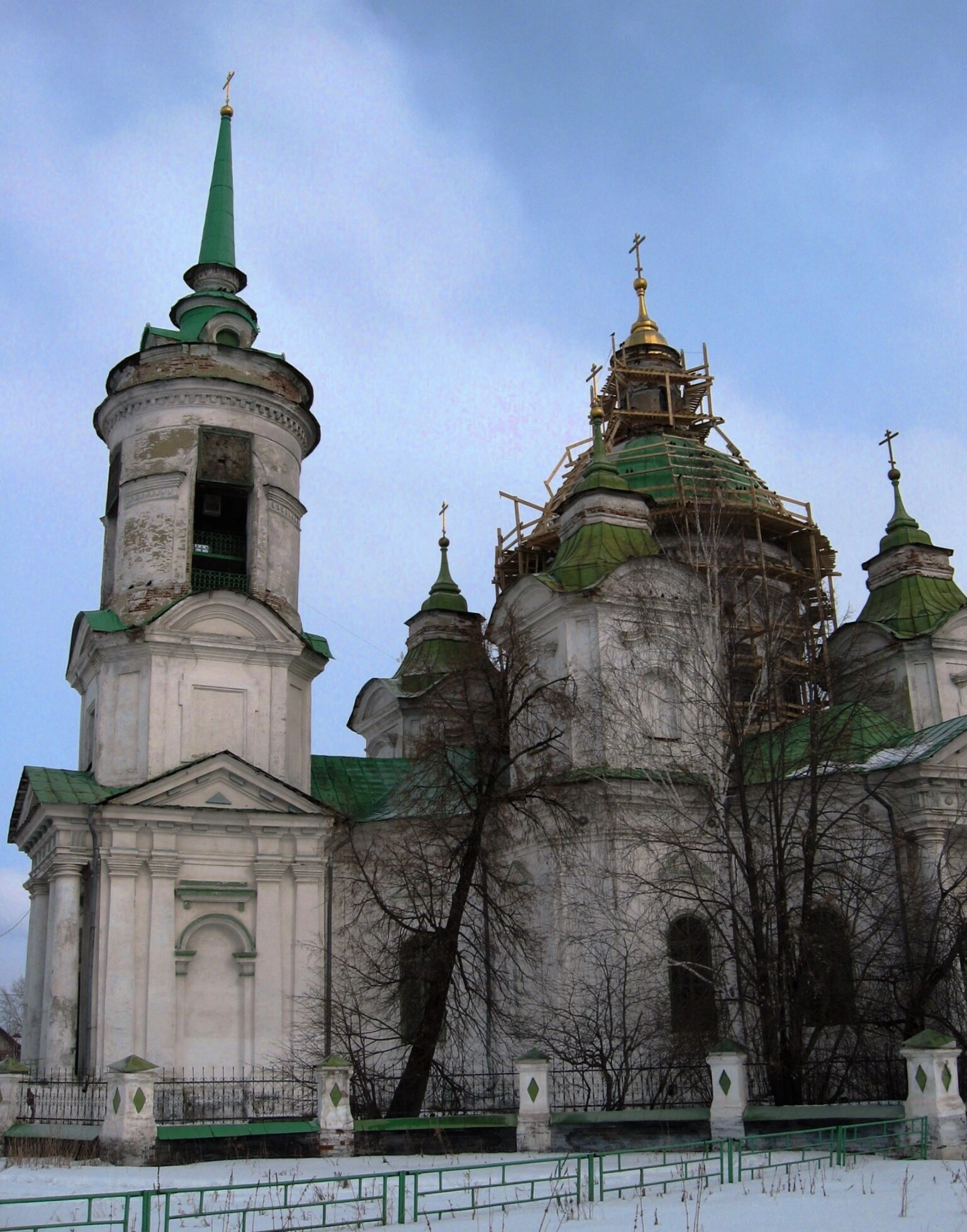 Важной деталью, свидетельствующей о заботливом отношении к памятнику, являются установленные строительные леса на одном из барабанов, говорящие о проведении реставрационных работ по сохранению этого духовного и культурного достояния. Зимний пейзаж, заснеженные просторы и голые ветви деревьев подчёркивают суровую красоту уральской земли, на которой возвышается этот светлый образец православной веры и мастерства уральских зодчих. Храм не просто является архитектурной доминантой села, но и продолжает оставаться действующим духовным центром, привлекая паломников и ценителей старины.