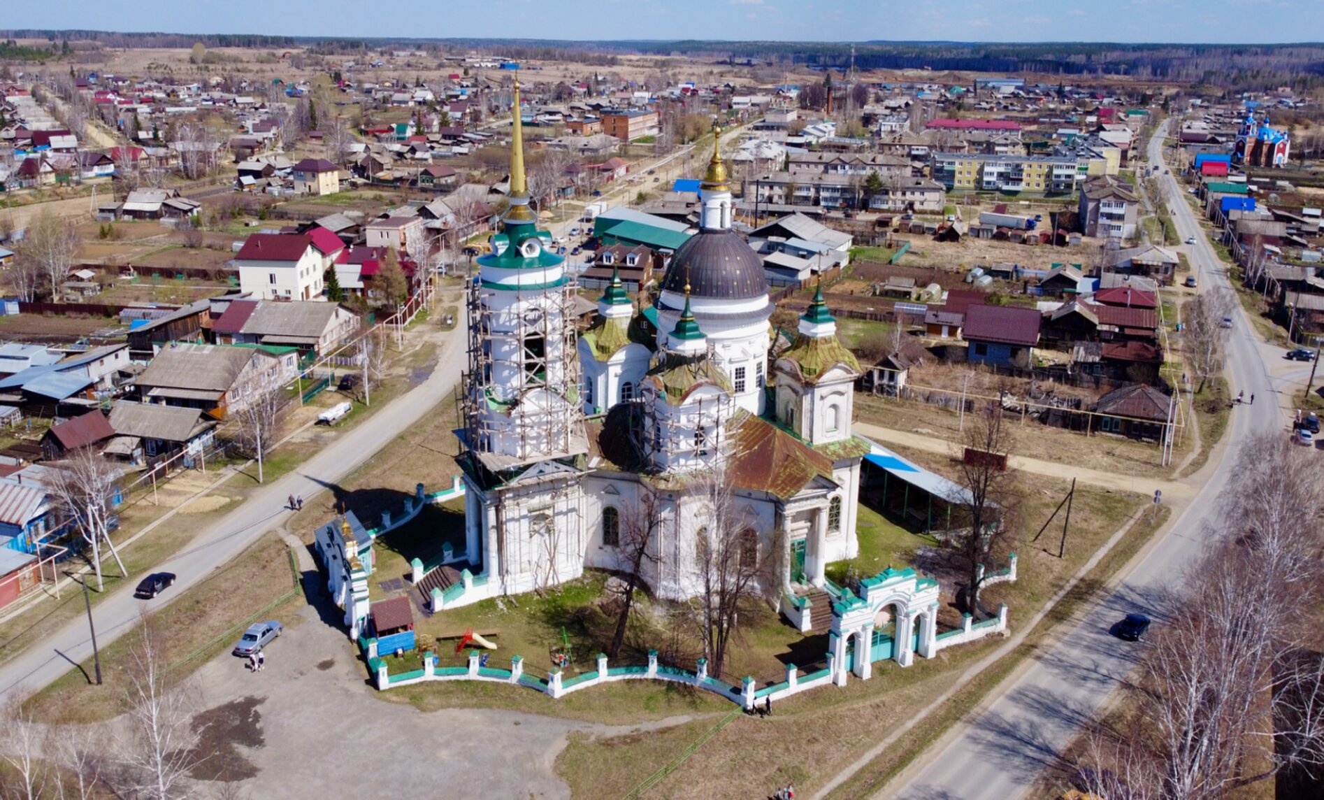 На представленной фотографии запечатлён старинный православный храм во имя Святителя Николая Чудотворца, расположенный в уральском селе Быньги. Монументальное каменное здание церкви, возведённое в конце XVIII века на средства богатых местных заводовладельцев, является выдающимся памятником уральской храмовой архитектуры и объектом культурного наследия.