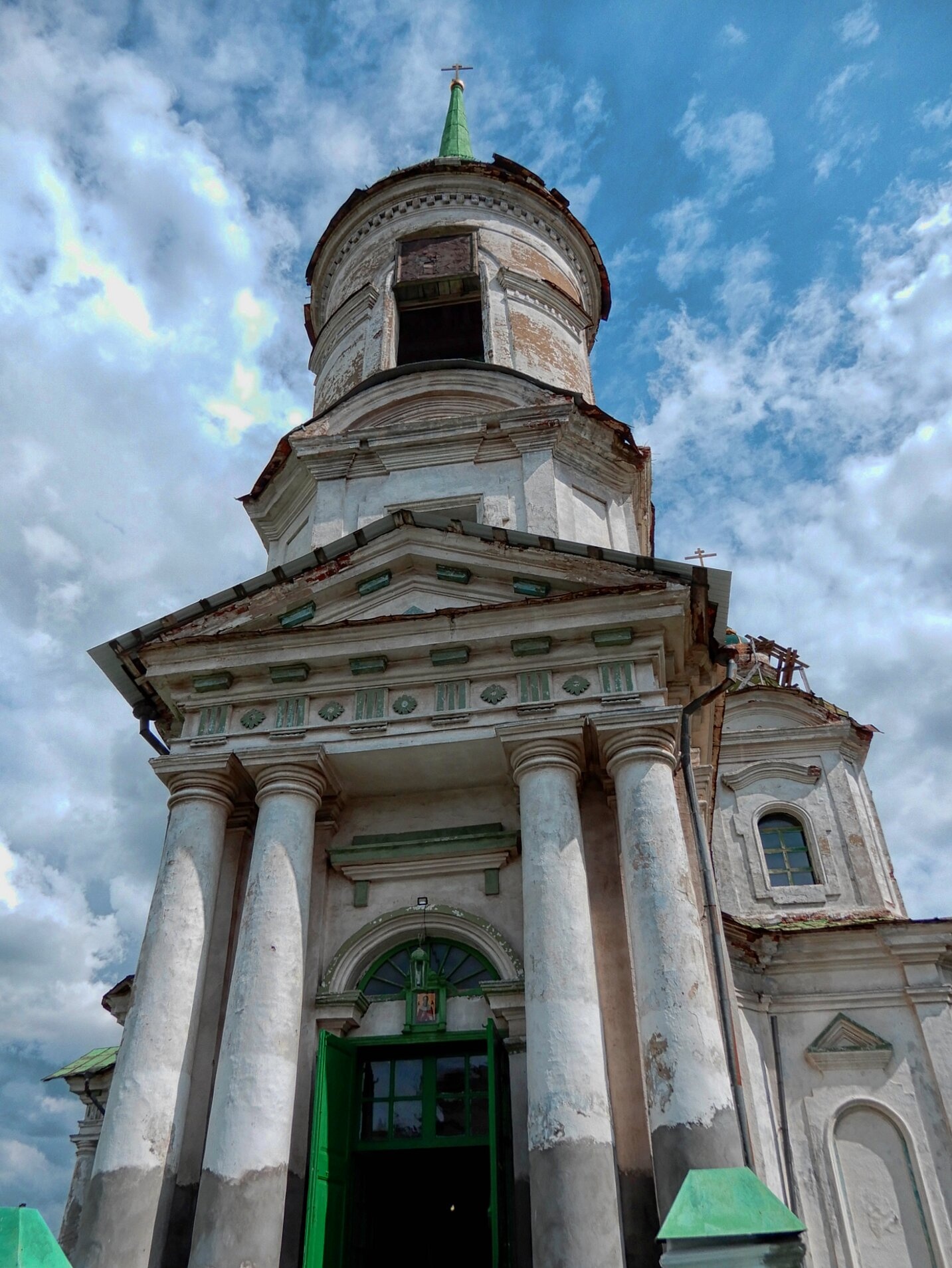 Фасад храма, который мы видим на снимке, украшен пилястрами и арочными оконными проёмами с наличниками. Несмотря на заметные следы времени, здание сохраняет своё благолепие и величие. Ярко-зелёная входная дверь символично выделяется на фоне светлых стен, напоминая о надежде и вечной жизни во Христе. Храм расположен на открытой местности, а высокое небо с облаками, раскинувшееся над ним, придает фотографии особую духовную атмосферу и величие.