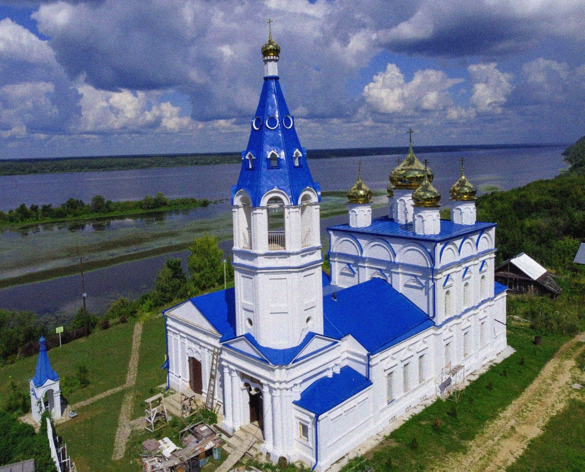 На фотографии запечатлён восстанавливаемый храм во имя Святителя Николая Чудотворца, расположенный в старинном селе Исады Спасского района Нижегородской области. Церковь живописно стоит на высоком берегу реки Суры, что подчёркивается на снимке широким водным пространством на заднем плане.