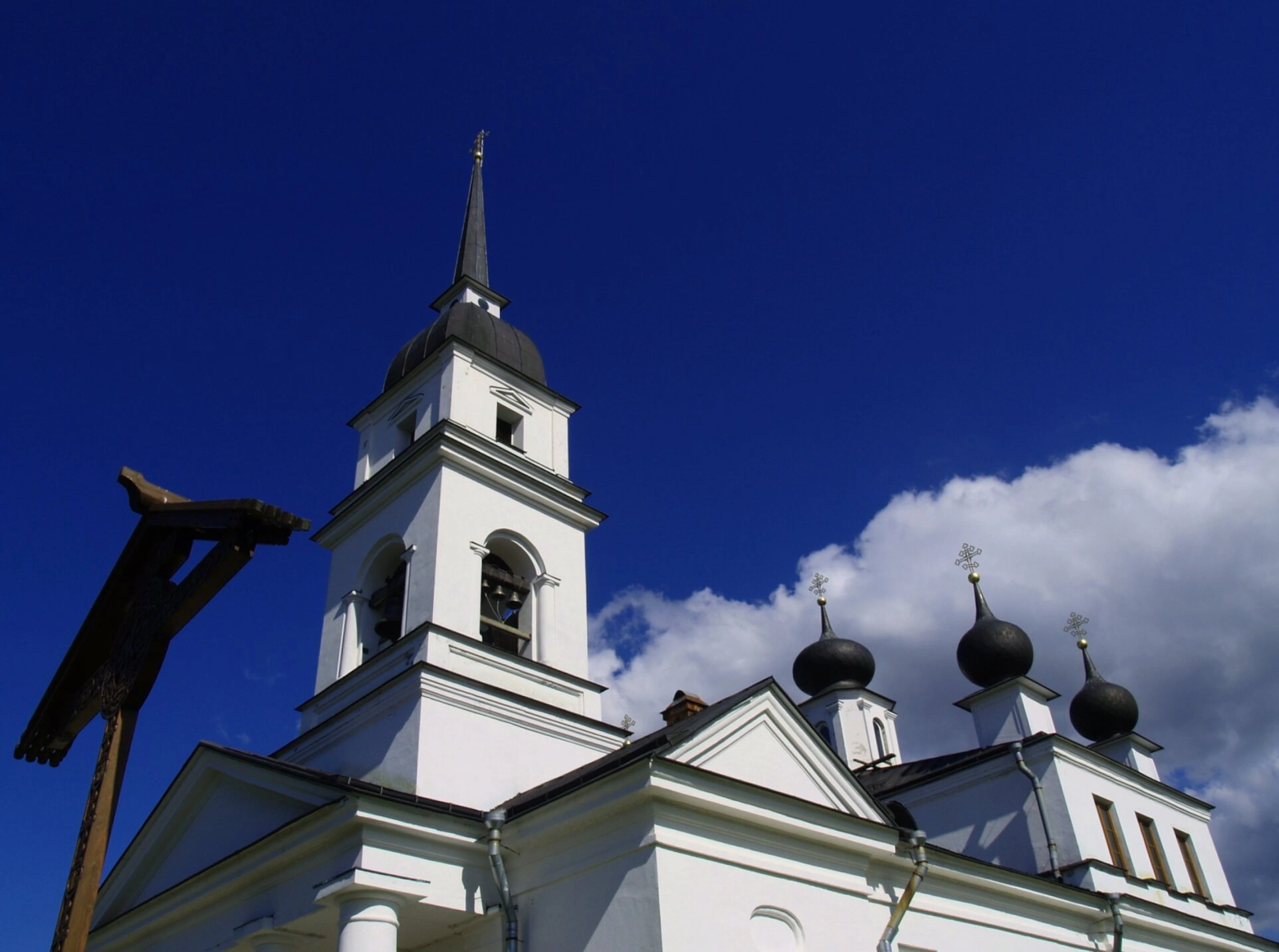 На снимке хорошо видна высокая колокольня со шпилем, главный купол и малые главы, традиционные для русского церковного зодчества. Композиционным центром кадра является светлый фасад храма, контрастирующий с лазурным небом и лёгкими облаками. На переднем плане слева виден фрагмент деревянного поклонного креста или памятного знака.