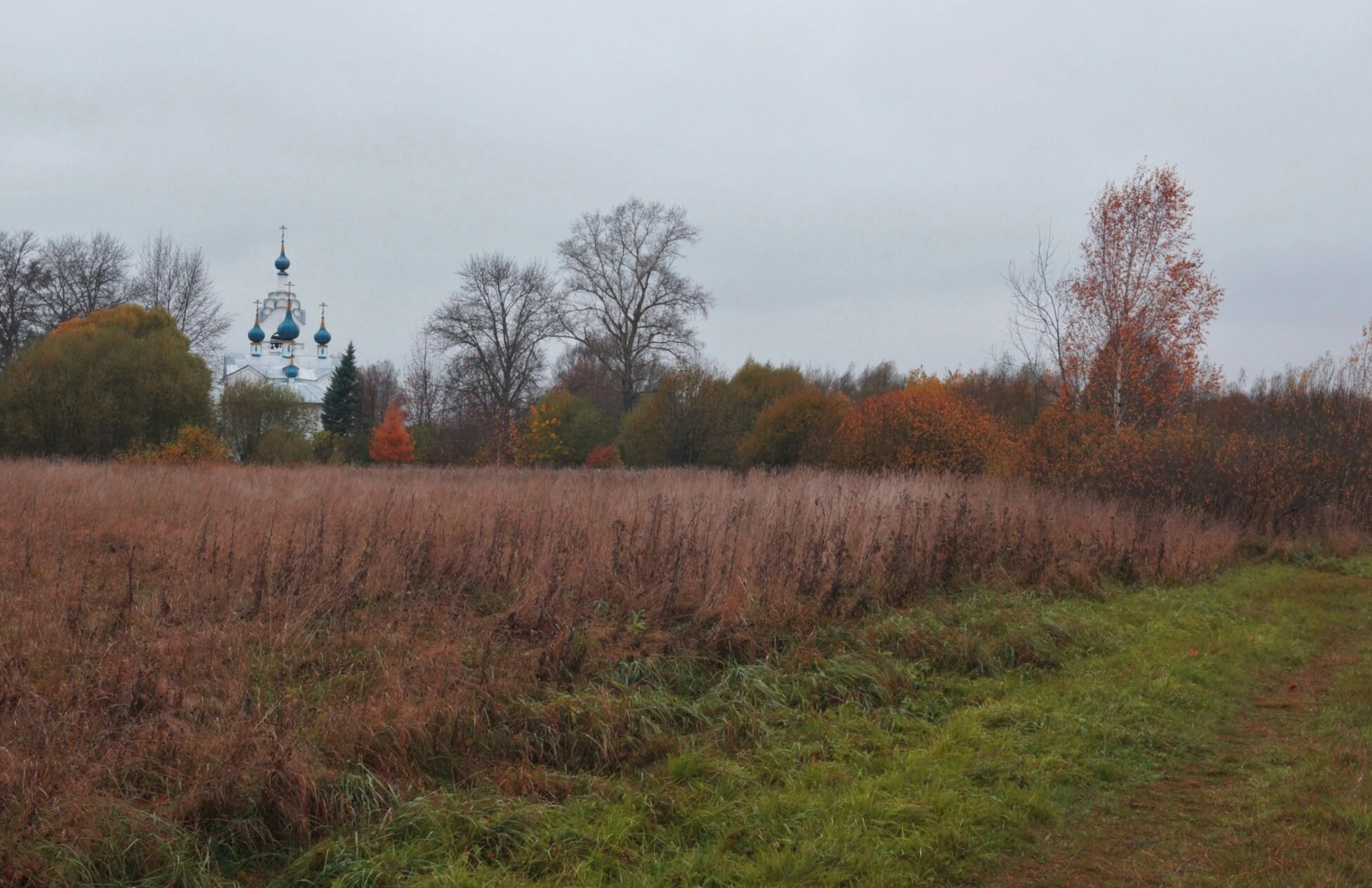 На переднем плане простирается поле, покрытое пожухлой травой, что символизирует увядание временного и тленного. На фоне осенней природы, где деревья уже частично сбросили листву, а другие украшены золотыми и багряными одеждами, особенно ярко выделяется светлый храм с синими главами, увенчанными златоглавыми крестами.