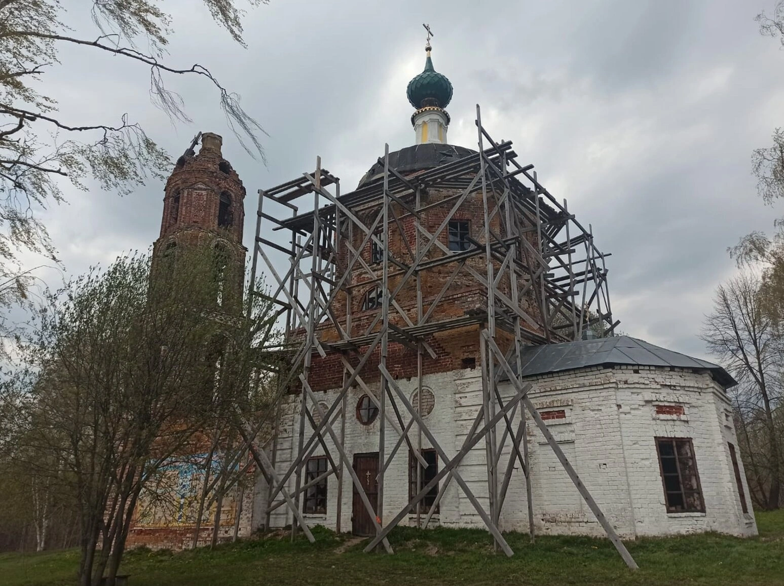 Данная фотография представляет значительный исторический интерес, фиксируя важный этап в жизни святого места — его возрождение из запустения для возвращения к полноценной liturgical жизни. Вид храма, окружённого лесами, символизирует надежду на полное восстановление былой красоты и духовного значения этой святыни для верующих. Молитвенная атмосфера и благодать, свойственные этому месту, ощущаются даже через объектив фотокамеры.