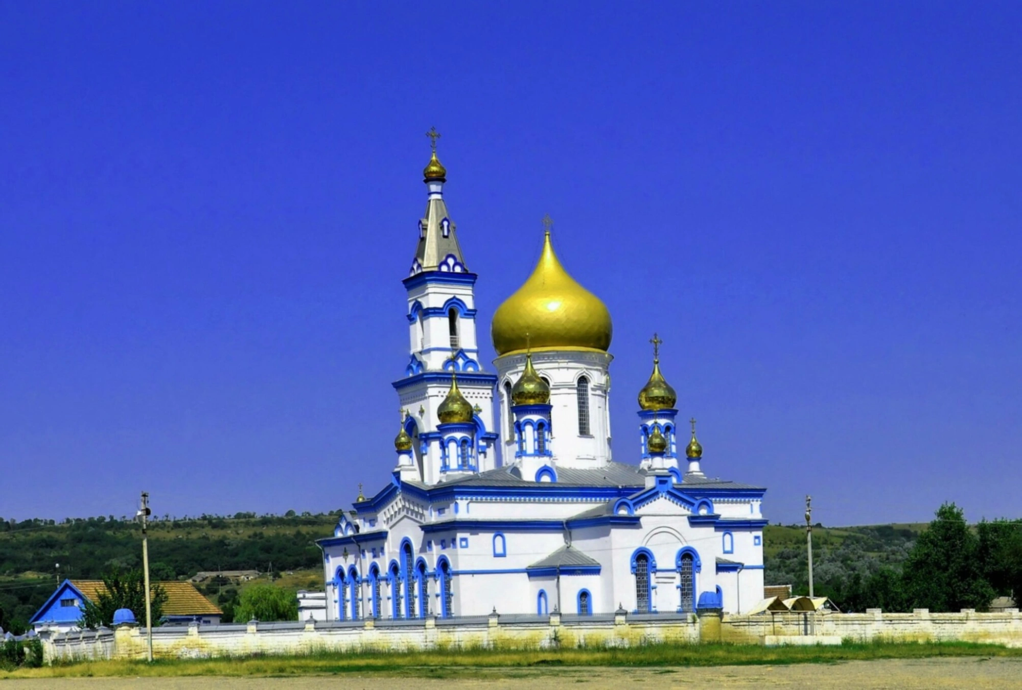 Архитектура храма являет собой образец крестово-купольного зодчества. Основной объём здания, выкрашенный в светлые тона, венчает центральный золочёный купол луковичной формы, вокруг которого располагаются четыре малых главки. С западной стороны к храму примыкает высокая колокольня, завершающаяся шпилем с крестом. Фасады украшены арочными оконными проёмами с наличниками, выполненными в лазурных оттенках, что создаёт яркий и праздничный образ на фоне чистого неба и зелёных холмов.