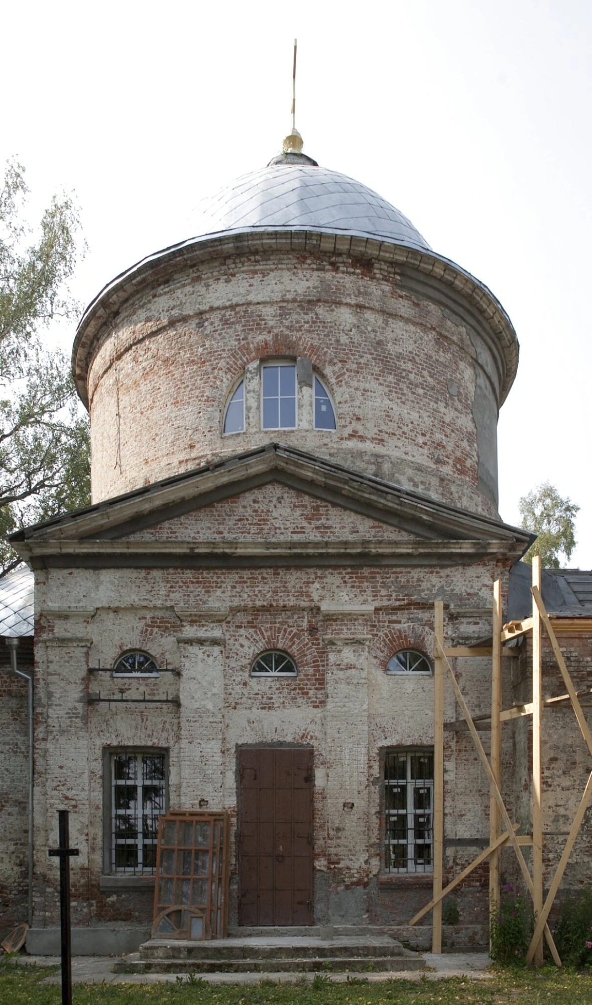 На фотографии можно наблюдать храм в процессе проведения реставрационных работ, о чём свидетельствуют аккуратно установленные строительные леса с правой стороны. Это свидетельствует о заботе верующих и ревнителей старины о сохранении духовного и архитектурного наследия. Арочные оконные проёмы, килевидные закомары и тщательно проработанный кирпичный декодор фасадов создают неповторимый облик этого houseа молитвы.