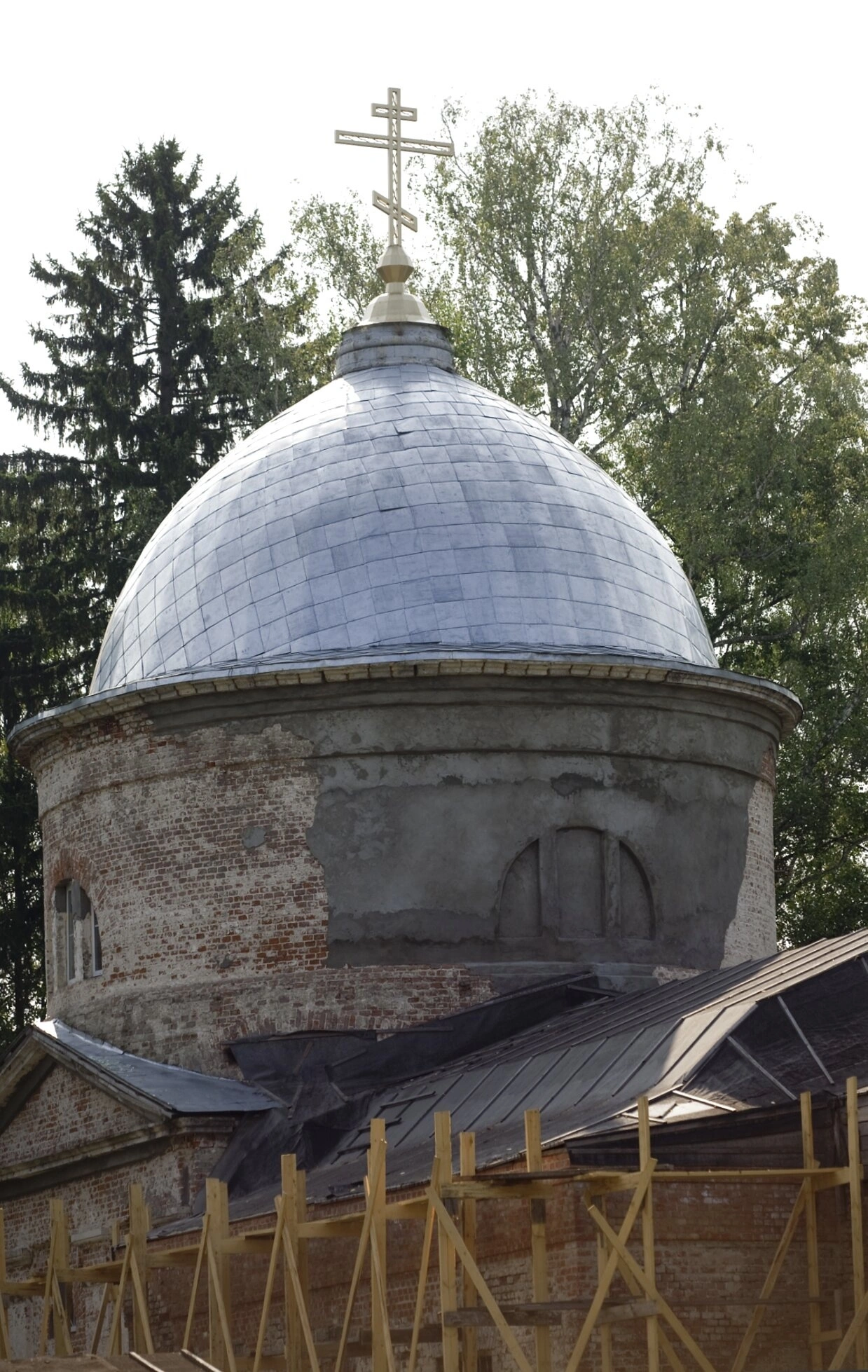 Восьмигранный барабан, на котором возвышается главный купол, и завершения стен украшены изящными кирпичными аркатурными поясами и декоративными кокошниками, что является характерным элементом русского церковного зодчества. Сам купол, покрытый серым металлическим листом, увенчан золочёным православным восьмиконечным крестом, сияющим под небесным светом и символизирующим победу Господа нашего Иисуса Христа над смертью.