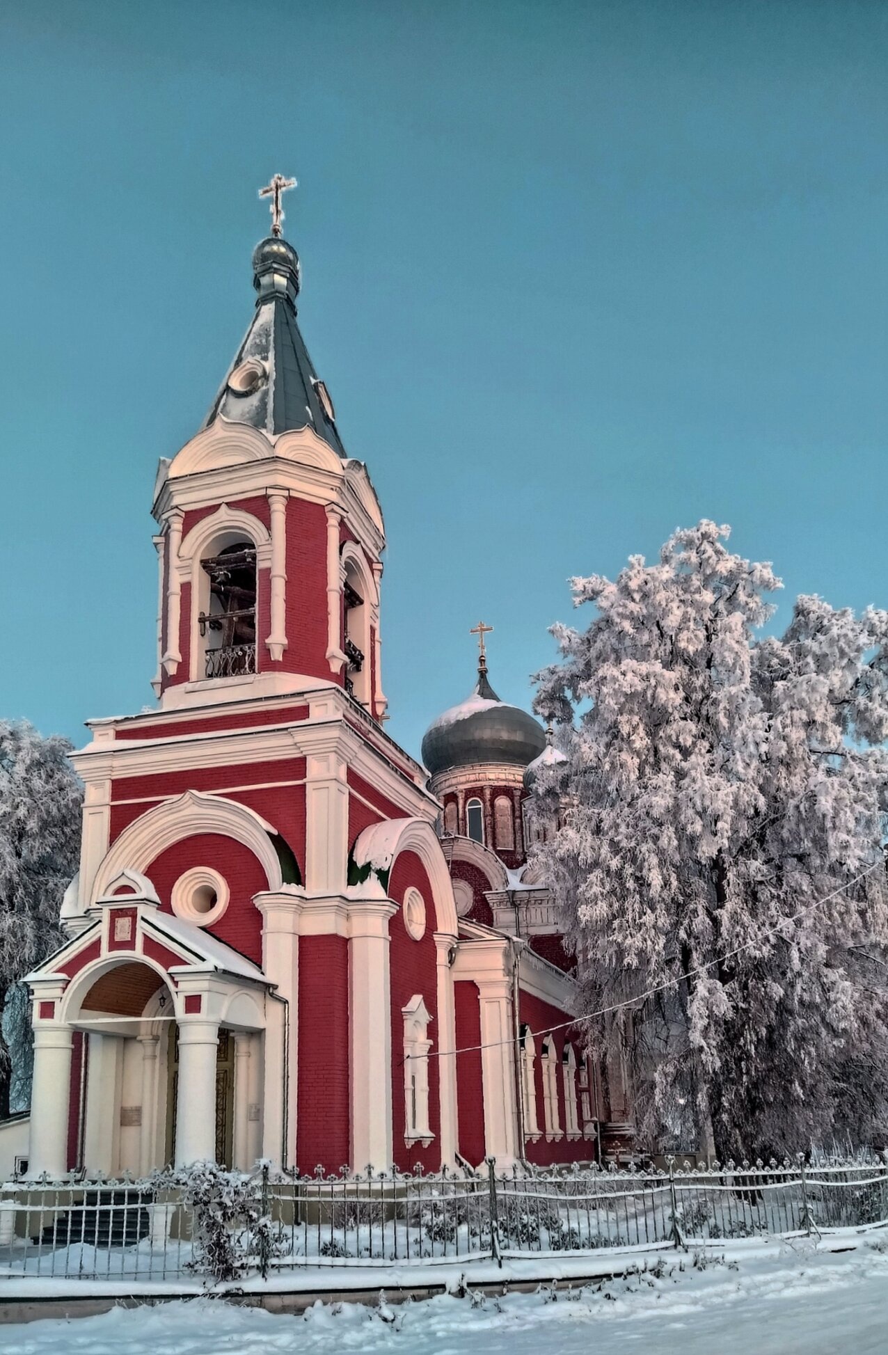 Фотография передаёт особую атмосферу духовного уединения и покоя, характерную для сельских храмов. Белоснежный покров подчёркивает строгие линии и лаконичность форм здания, выполненного в стиле классицизма. Снег на крышах, куполах и окружающей территории создаёт ощущение чистоты и нетронутости, символизируя святость этого места. Храм действует, и в его стенах регулярно совершаются богослужения, собирая верующих из окрестных деревень.