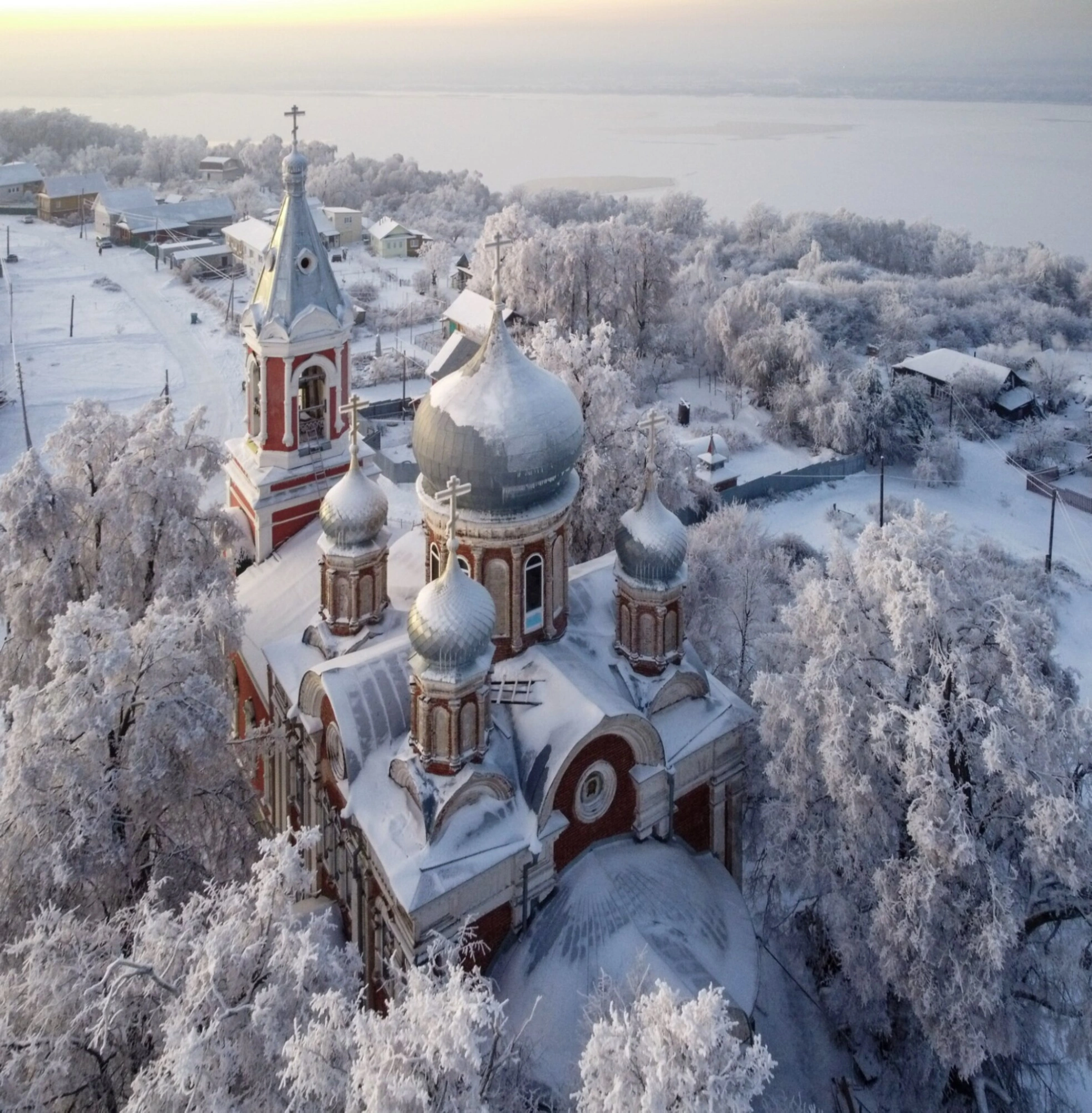 На представленной фотографии запечатлен величественный вид Церкви во имя Святителя Николая Чудотворца, расположенной в старинном селе Просек Кстовского района Нижегородской области. Снимок выполнен с высоты птичьего полета в зимнее время, что придает образу особую торжественность и чистоту. Храм, укрытый белоснежным покровом, и окружающий его пейзаж, запорошенный снегом, создают картину благоговейного спокойствия и умиротворения.