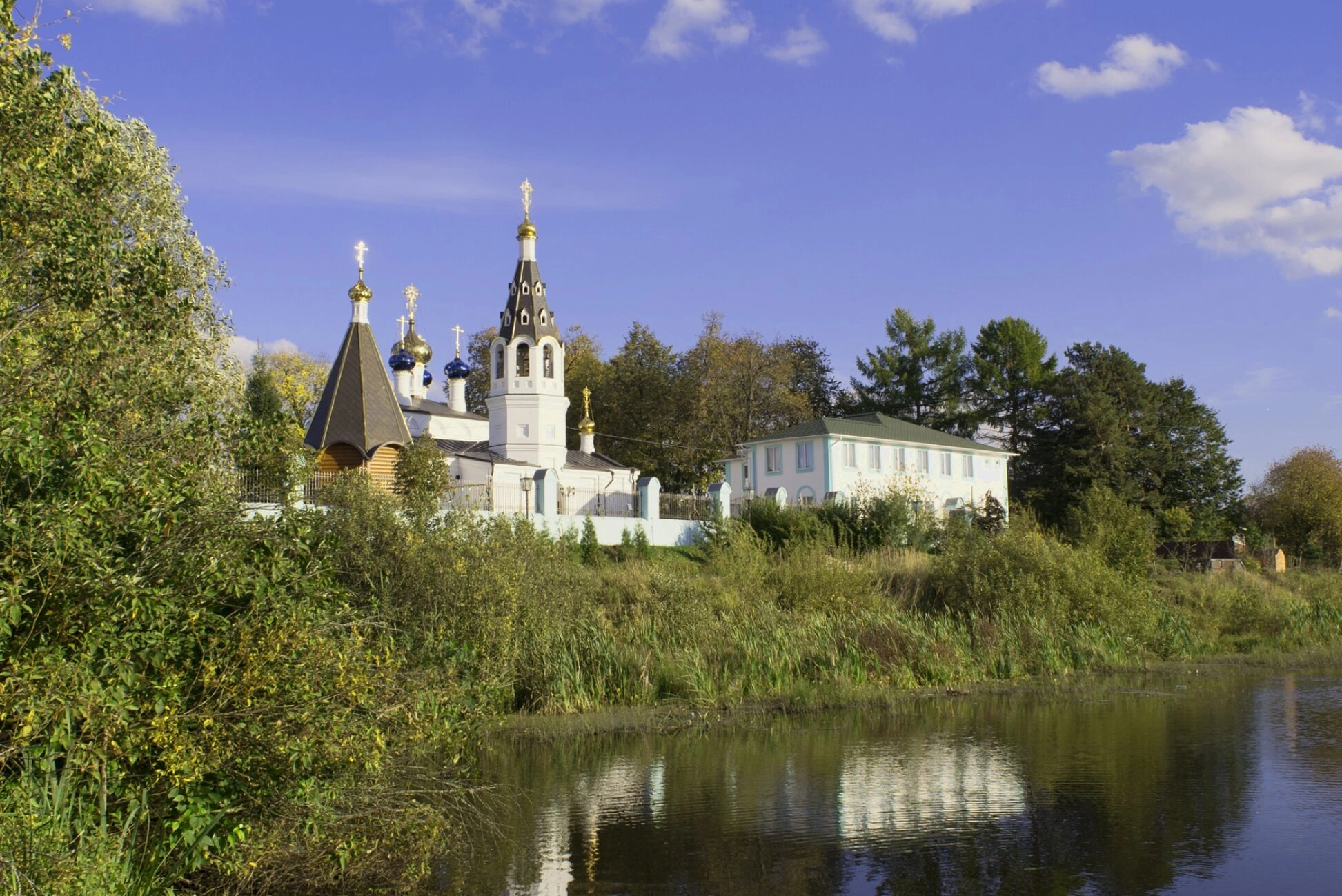 На представленной фотографии запечатлён величественный православный храм во имя Святителя Николая Чудотворца, расположенный в старинном селе Сидоровское Московской области. Святыня живописно возвышается на берегу тихого водоёма, отражаясь в его глади, что придаёт ей особую благодатную красоту и одухотворённость.