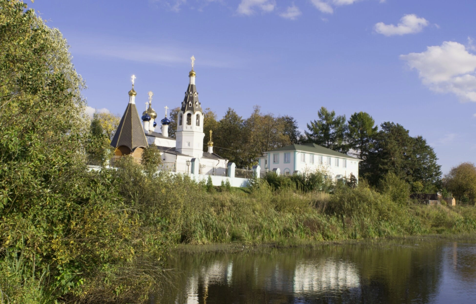 На представленной фотографии запечатлен прекрасный вид на храм во имя святителя Николая Чудотворца, что располагается в селе Сидоровское городского округа Подольск Московской области. Святыня живописно стоит на возвышенном берегу водоема, что придает ей особую благодатную красоту и величие, отражаясь в тихой водной глади.